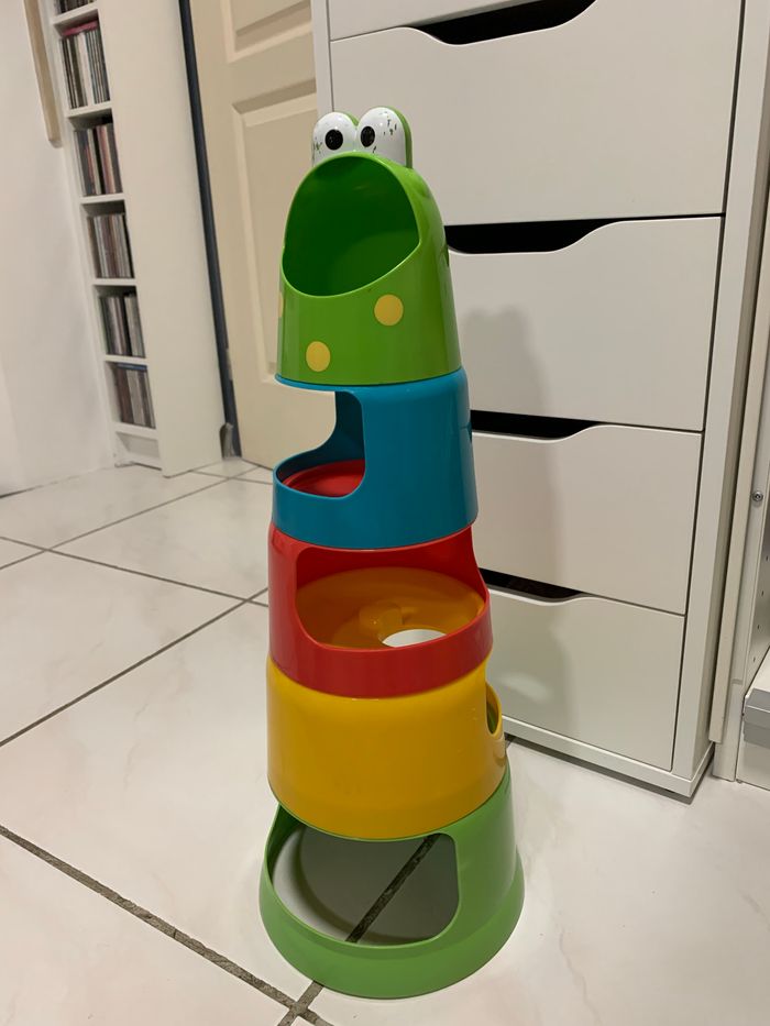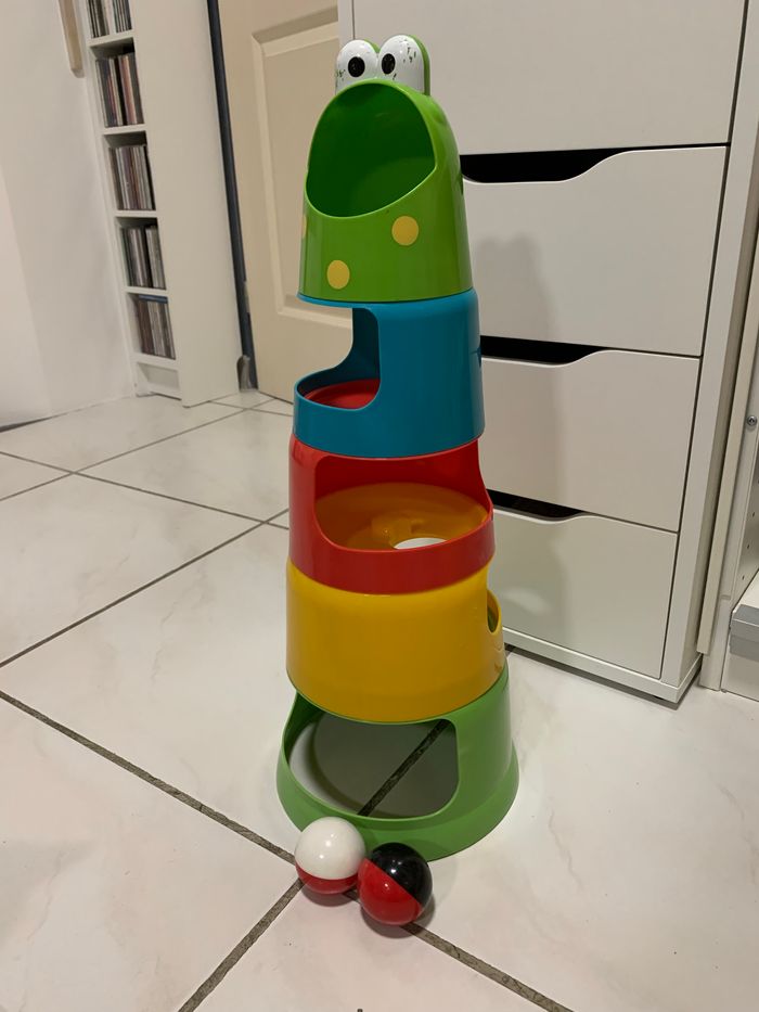 Une tour grenouille, avec deux balles qui descendent de la tête aux pieds par des trous.