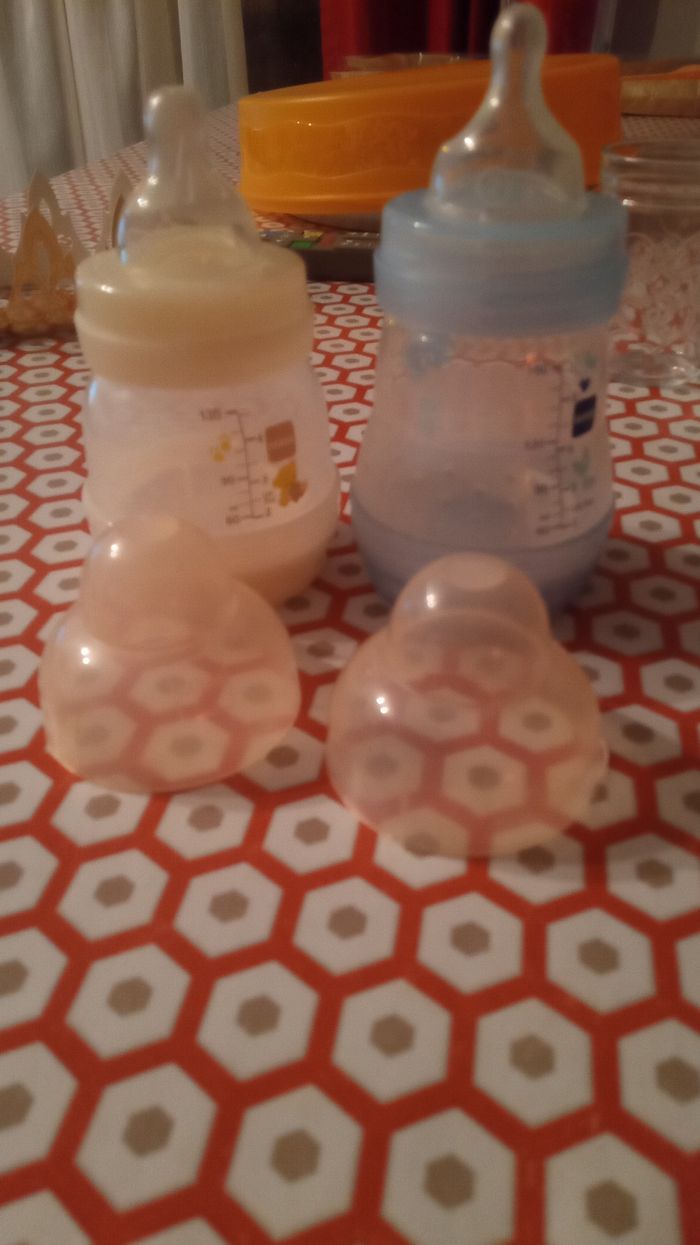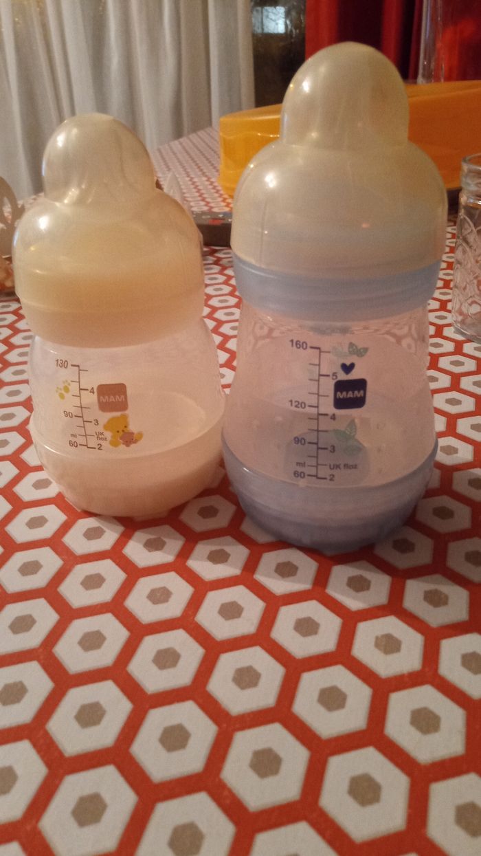 Deux biberons de 130 et 160 ml avec tétines neuves. Marque MAM ils se démontent entièrement et passent au lave vaisselle.