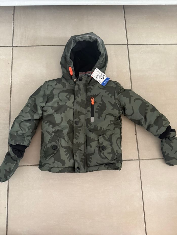 Neuf Manteau chaud polaire doudoune garçon dinosaure kaki taille 18 mois 2 ans