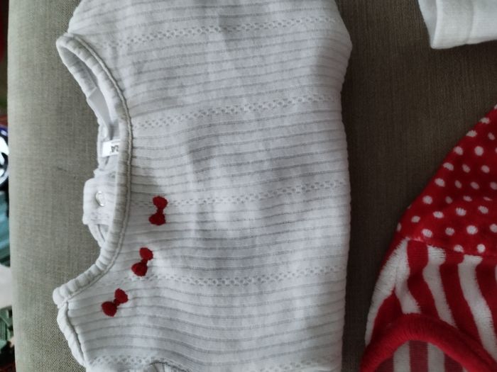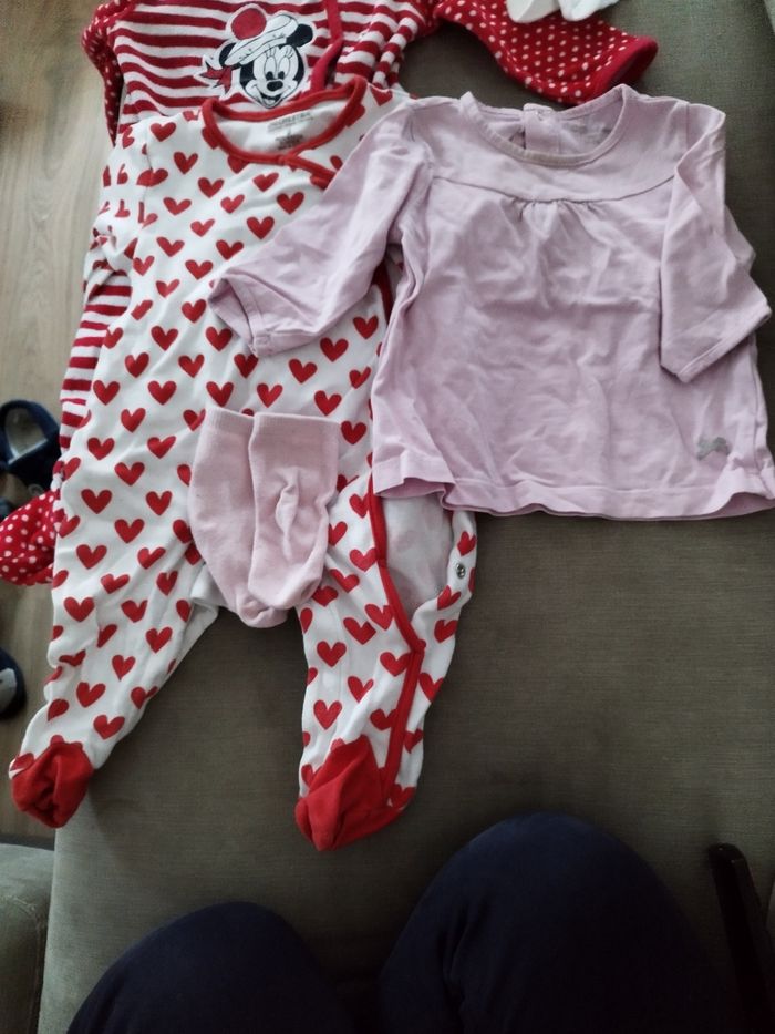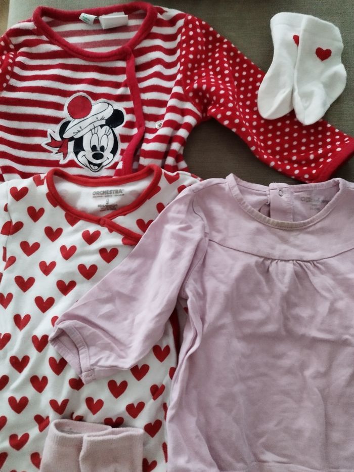 Lot de t shirts manches longues, grenouillères & chaussettes T shirt blanc noeuds rouges et t shirt rose orchestra Chaussettes roses et chaussettes blanches coeurs rouges Grenouillère fine blanche coeurs rouges orchestra et grenouillère velours rayée et à pois rouge et blanche motif minnie Disney baby