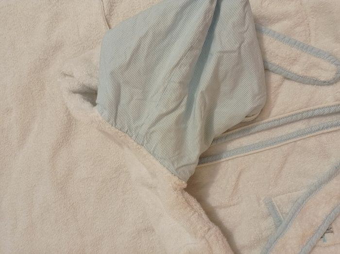 Peignoir pour garçon de poche avec ceinture taille 1 an blanc et bleu deux poches devant une ceinture marque  Sylvie thirier très grande marque connue très bon état capuche bleu rayé le bas dimanche le bas des poches et ceinture voir photos - photo numéro 7