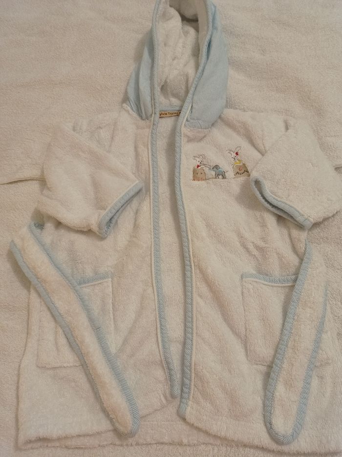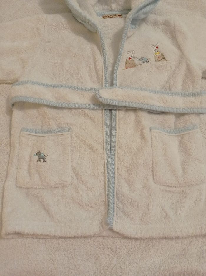 Peignoir pour garçon de poche avec ceinture taille 1 an blanc et bleu deux poches devant une ceinture marque Sylvie thirier très grande marque connue très bon état capuche bleu rayé le bas dimanche le bas des poches et ceinture voir photos