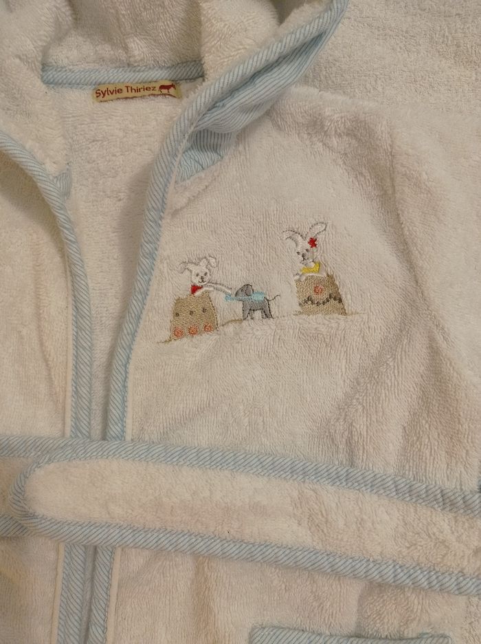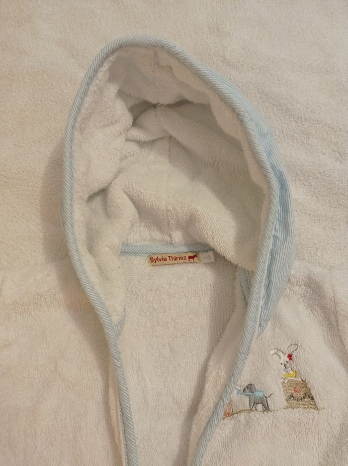Peignoir pour garçon de poche avec ceinture taille 1 an blanc et bleu deux poches devant une ceinture marque  Sylvie thirier très grande marque connue très bon état capuche bleu rayé le bas dimanche le bas des poches et ceinture voir photos - photo numéro 10