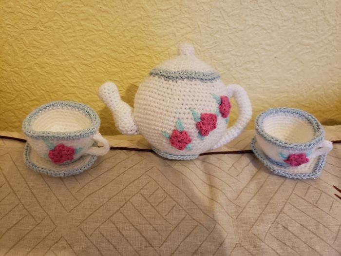 Fait de laine et de coton, ce service à thé n'attend plus que les petits biscuits. Pour passer de super moments de jeux. Pour decorer ou pour jouer n'hésitez plus à l'offrir.