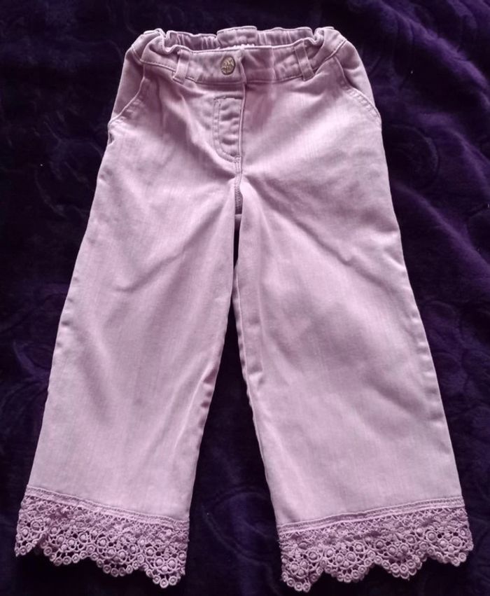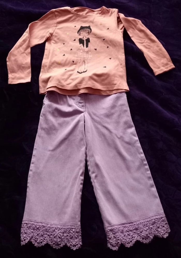 ENSEMBLE 5 ANS composé d'un tee shirt KIABI avec motif pailleté et d'un pantalon C&A, bas jambes dentelles, taille élastiquee avec ruban réglable, pression, poches