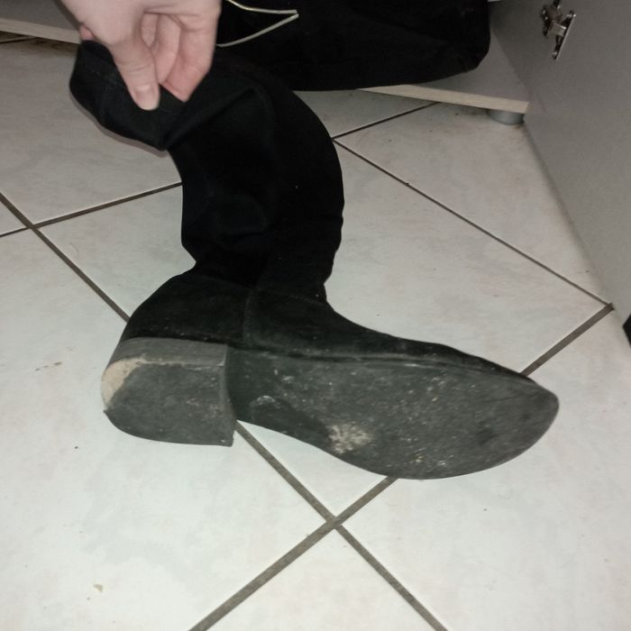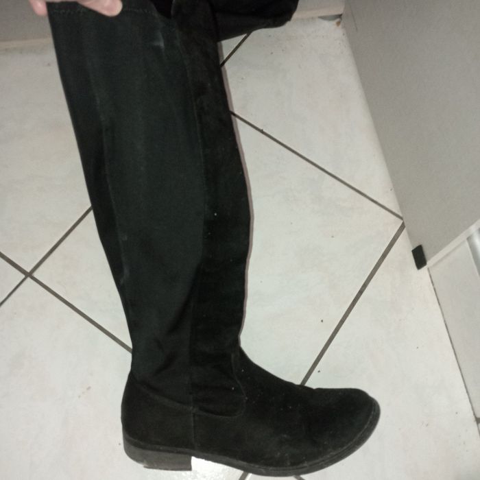 Je vends mes bottes noires montantes que j'adore en très bon état elastique au niveau des jambes. Détail de chaque côté les semelles sont légèrement abîmées au talon taille 39 et on jusqu'au 40 Je change de taille Achetées en magasin à 110 euros c'est de la bonne qualité
