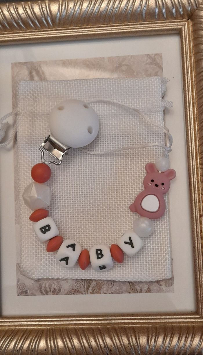 Attache tétine personnalisé avec le prénom de votre choix avec adaptateur et pochette cadeau. Réalisation et envoie sous 48h salon le stock disponible. Tout le matériel utilisé est aux normes européennes . Perles en silicone ou en bois ou un mélange selon les modèles . En respectant les normes de sécurité pour bébé ,n'hésitez pas à regarder dans mon dressing il y a plusieurs modèles et aussi à m'envoyer un message pour plus d'informations. 🔴 une petite remarque pour les prénoms qui sont très long il y aura forcément moins de perles sur les cotés ou quelques changements sur le modèle c'est pour respecter les normes de sécurité pour bébé il y a une langueur à respecter merci pour votre compréhension. 🔴Aussi l'utilisation de l'attache doit être sous surveillance et toujours vérifier si l attache tétine est intacte et les nœuds sont toujours bien fermés pour la sécurité de nos boutchous. Je vous remercie pour la lecture de ces consignes..