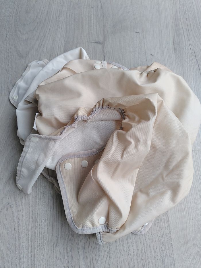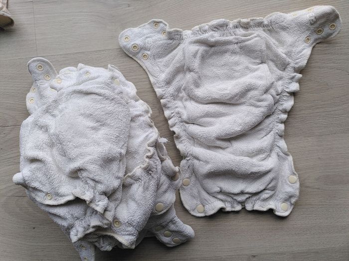 Je vends ces couches de nuit d'occasion, usées mais encore très fonctionnelles. Ainsi que 4 inserts, 3 surcouches en laine et des surcouches en PUL. Le lot contient : -5 couches Diddy Diaper by Nature Babies. 3 sont abîmées et deux en assez bon état (voir photos). N'entrave pas l'absorption. -5 couches Popolini en bon état. -3 booster AmBum en bambou qui sont très absorbants ! Un tt petit peu abimés (voir photos). -3 surcouches en laine Popolini, lanisolés, taille 86/92. -4 surcouches en PUL (certains boutons pressions manquent, mais utilisables) -3 snappy pour les couches Nature Babies. Ces couches lavables ont été decrassées avant la mise en vente (bain de percarbonate) ainsi que plusieurs fois pendant leur utilisation. Elles étaient lavées avec une lessive en poudre en deux cycles : -30° avec un tiers de lessive, cycle court. 1400t/minute. -60° avec l'entièreté de la lessive, cycle long. 1400t/minute. Ne pas hésiter pour des questions et d'autres photos. Ne pas hésiter à regarder mes autres annonces pour couches de jour Hamac et insert AmBum de nuit. Prix à négocier. Voiles jetables pouvant être rajoutés a la commande.