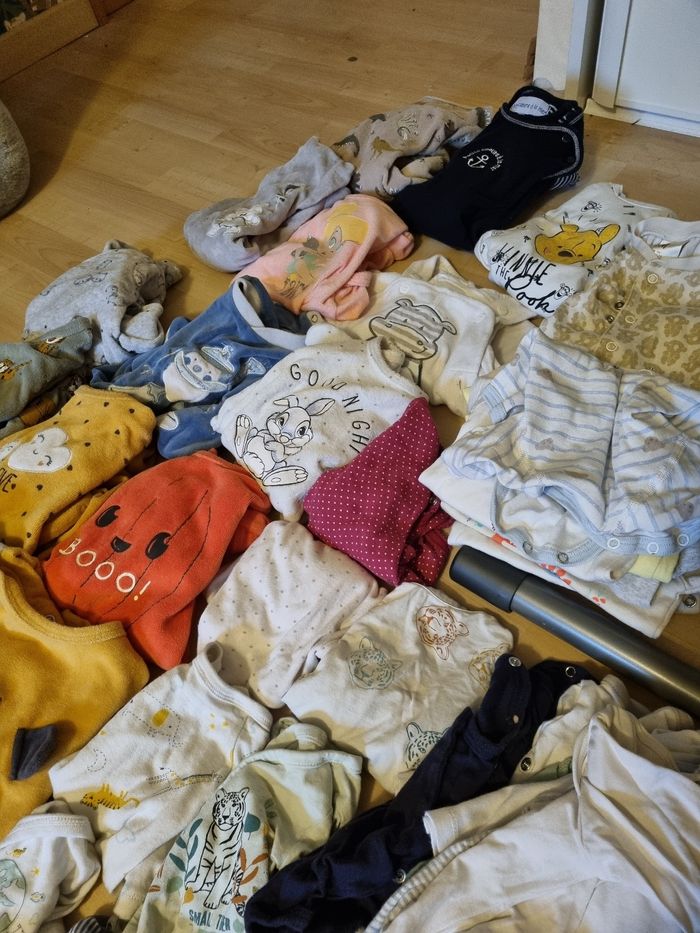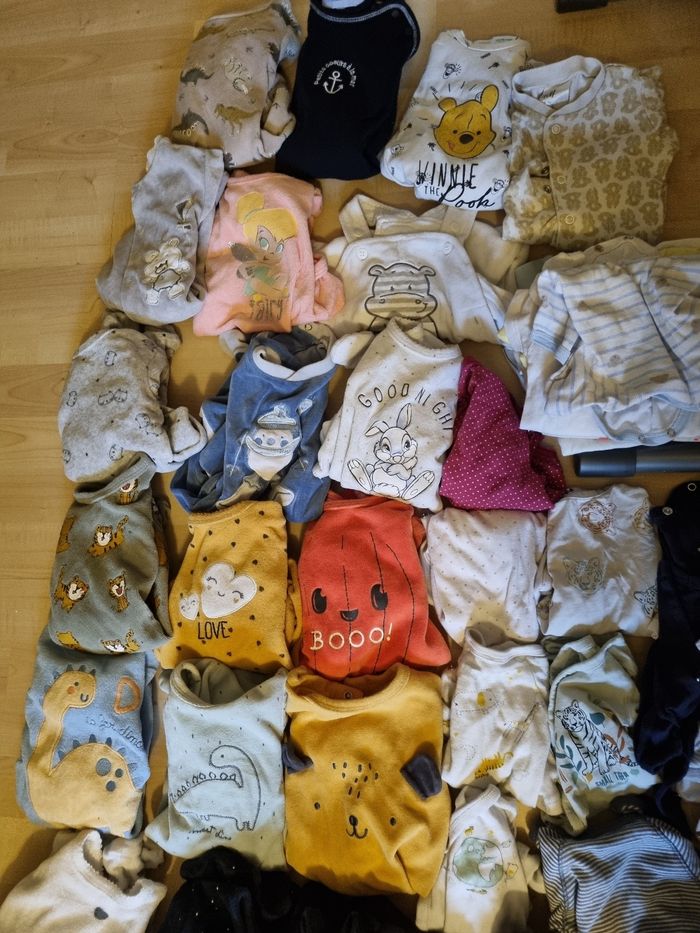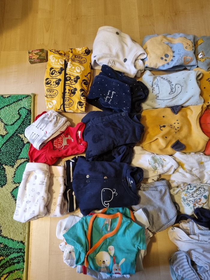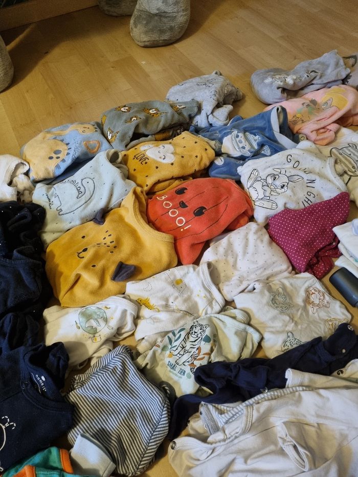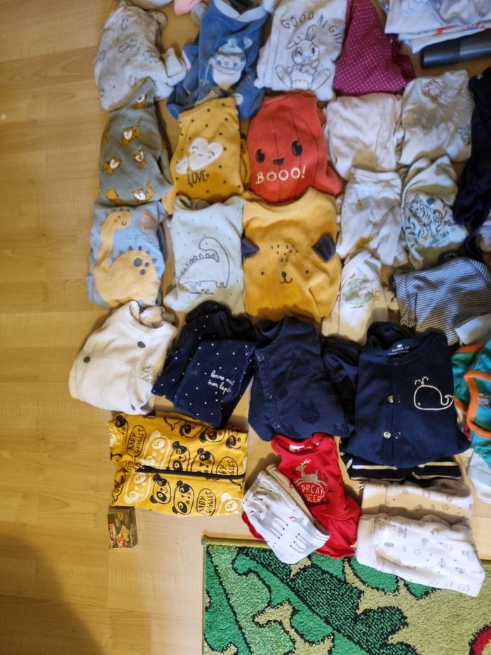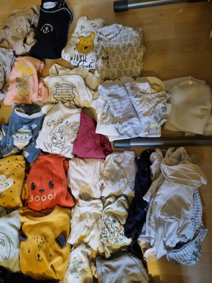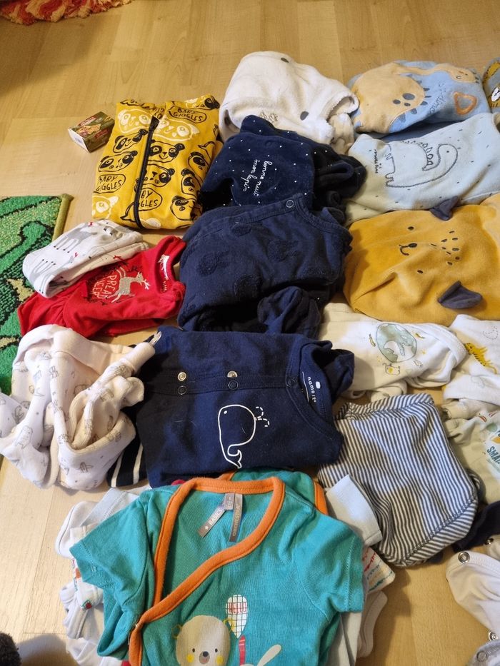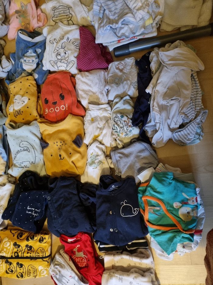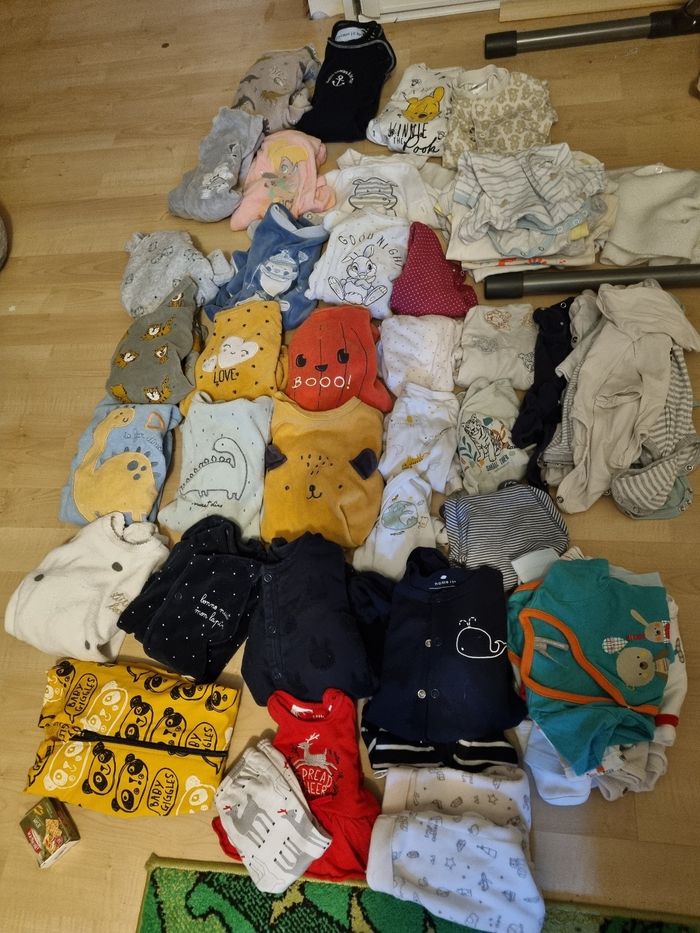 32 body 2 pantalons 46 cm 15 pijamas molton 6 pijamas coton 1 tenue Plus quelques pièces qui sortent du lave linge 😁 Quelques taille nouveau née et le reste 1 mois Marque kiabi, tex, orchestra ... 56 pièces 50 euros Possible d'acheter individuel entre 2 et 1 euros la pièce. Et n'hésitez pas à venir voir si vous êtes intéressé 😁👍
