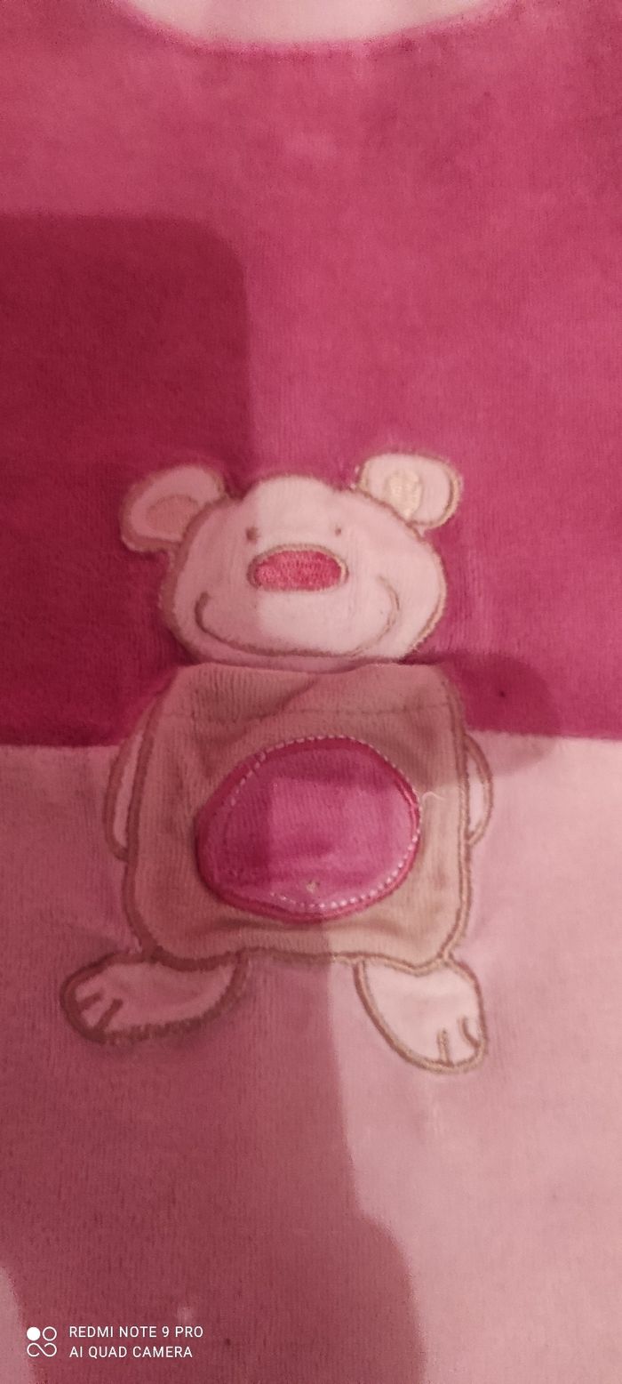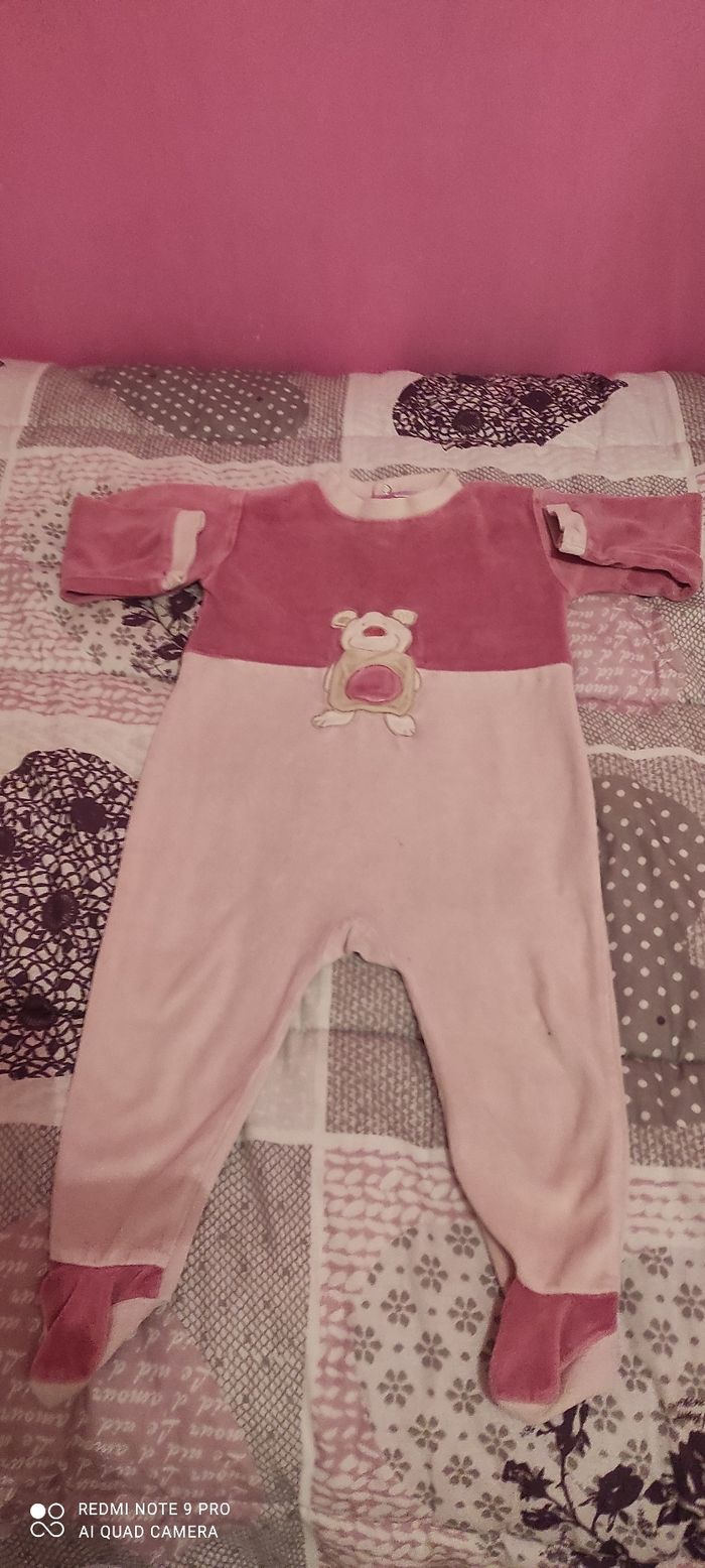 Grenouillère velours avec petit poche nounours couleur rose bonne état porté quelques fois, taille 12 mois.