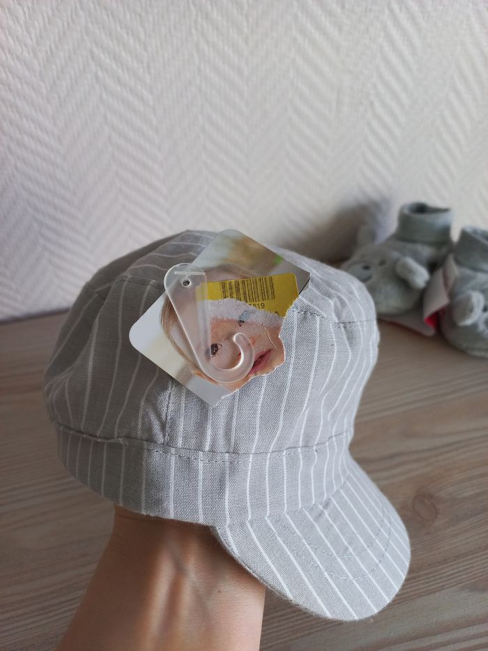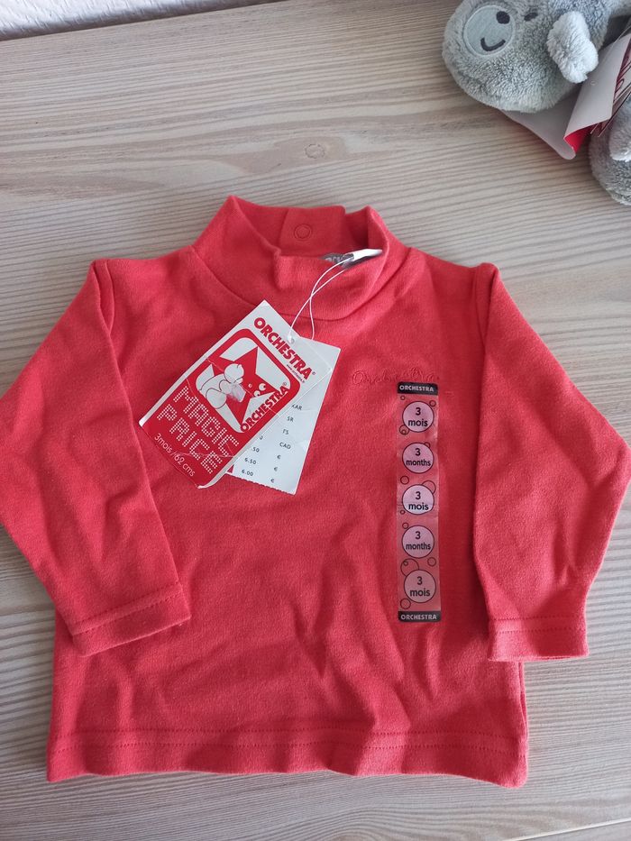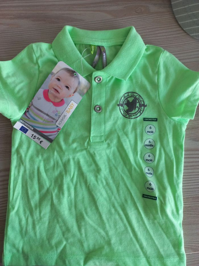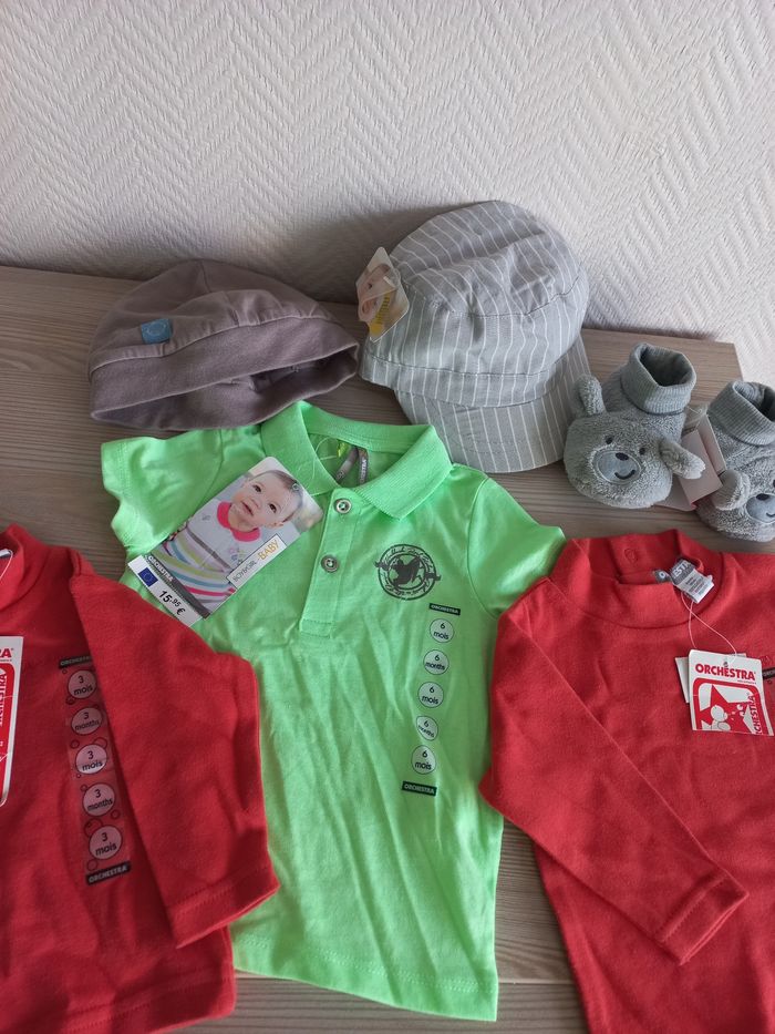 Tout est neuf, avec les étiquettes Taille 6 mois, sauf un t-shirt de 2 "qu'ils sont identiques d'ailleurs" ,qui est de 3 mois La valeur totale payée est de 45€