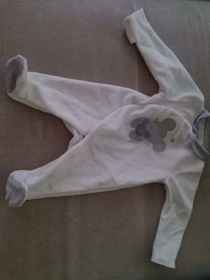 Pyjama hiver, blanc avec col, motif souris, fermeture par boutons pressions devant et entre-jambes jusqu'aux pieds, bouts des manches en moufles Taille: 1 mois / 53cm