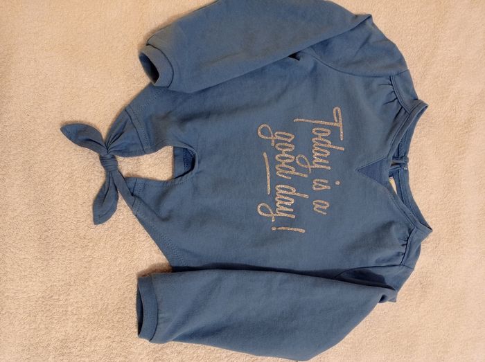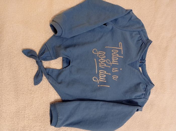 Pull bleu manche longue devant nu avec bouton derrière inscription devant brillante porter trois fois super jolie voir photos Marc Vertbaudet taille 6 ans 114 cm