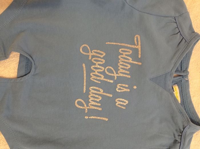Pull manche longue couleur bleu porter trois fois voir photos il se nous devan Vertbaudet taille 6 ans 114 cmt avec inscription brillante voir photos - photo numéro 5