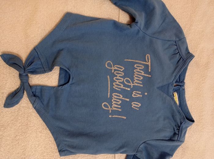 Pull manche longue couleur bleu porter trois fois voir photos il se nous devan Vertbaudet taille 6 ans 114 cmt avec inscription brillante voir photos - photo numéro 6