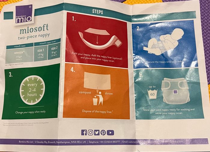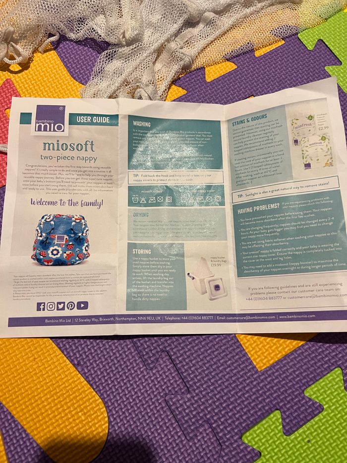 9 couches tout en un bambino mio - comme neuves La miosolo classique est une couche tout-en-un facile à utiliser et tendance. Elle se met comme toute autre couche, ce qui permet de changer bébé facilement. Système tout-en-un : couche complète où tout est attaché pour plus de praticité. De taille unique*: la couche est évolutive, elle s'adapte de bébé à la continence. Ajustez la taille de la couche grâce à ses boutons-pression pour l'adapter à la morphologie de votre bébé. Haute performance : système anti-fuites et cœur ultra absorbant. Protection assurée : élastiques anti-fuites aux cuisses et à la taille pour fournir une une sécurité maximale. Conçue pour rester sèche : effet bébé au sec afin de repousser l'humidité de la peau de bébé. Efficace à toutes épreuves : matière extensible et étanche pour offrir à bébé le plus grand confort dans tous ses mouvements. Sans produit nocif et ultra douce : pour le plus grand confort des petits derrières. Matière spéciale qui conserve sa douceur lavage après lavage. S'adapte à vos besoins : poche intérieure pour ajouter des inserts ou des boosters afin d'augmenter l'absorption de la couche dès que vous en avez besoin. Parfait pour les petits aux gros pipis ou pour de longues périodes. Facile à laver et à sécher : lavable en machine. Système de languette pour extraire facilement le cœur de la couche, ce qui améliore la qualité du lavage et réduit le temps de séchage. Ce produit est certifié OEKO-TEX® Standard 100. Vendues avec deux sac de lavage, un désinfectant, 3 insert boost neufs encore emballés et le guide d’utilisation