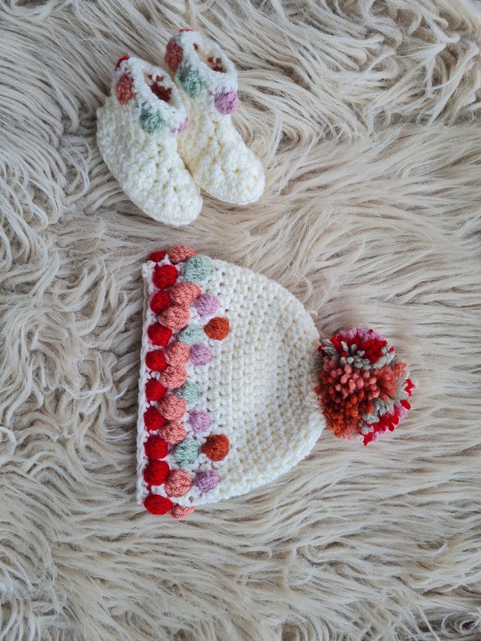 Ensemble pour bébé au crochet avec une bonnet et une paire de chaussons. Taille 0/3 mois, fait main.