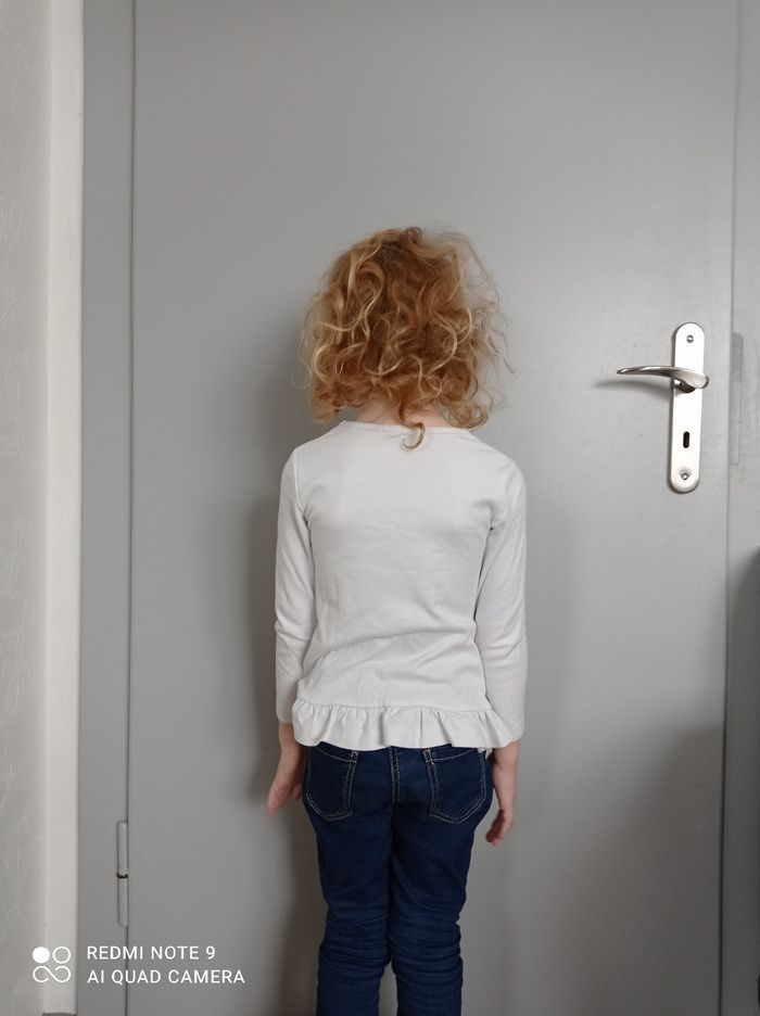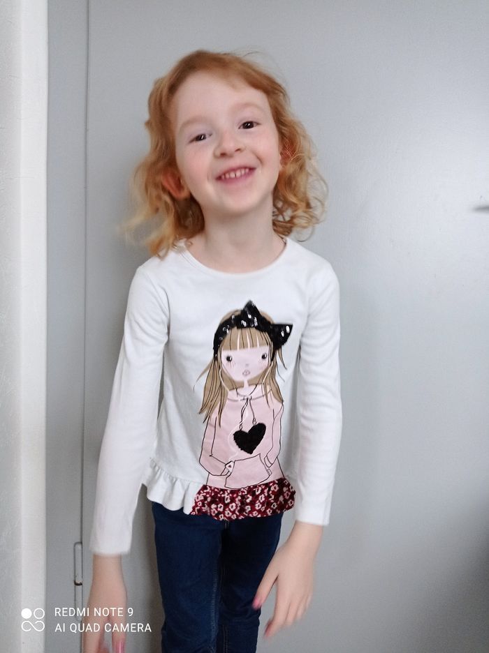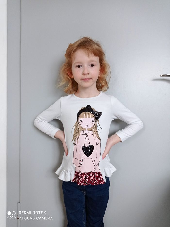 T-shirt blanc motif fille. Manches longues. Petits volants.