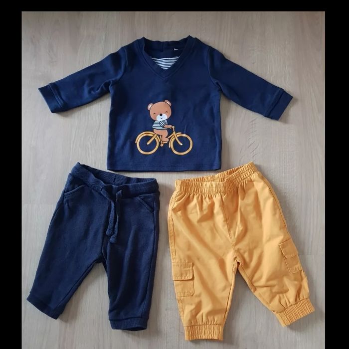 Pantalon jaune et haut neufs Bas jogging kiabi bleu en très bon état 6 mois
