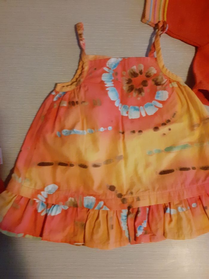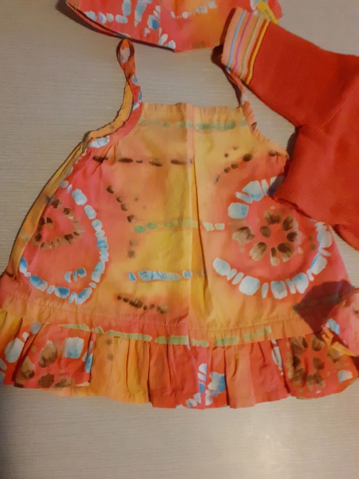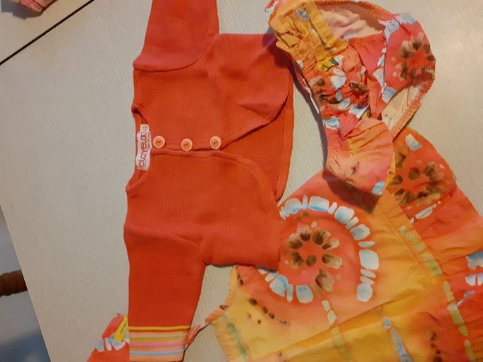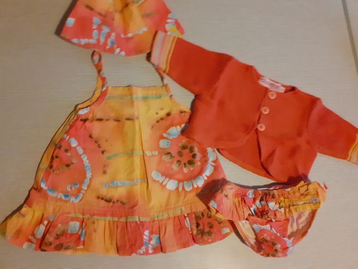 Lot 3 robes 1 rose marque Bourget 1 motifs robe + chapeau + culotte et gilet marque Clayeux 1 robe short rose clair