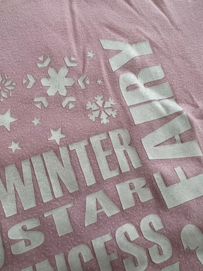 Sous pull à col roulé de couleur rose à manches blanches. Écritures sur le devant. Le tissu est légèrement bouloché, les écritures en bon état mais craquelé à quelques endroits. Bien chaud, idéal pour le ski. Pas d’étiquette de taille ou de marque. Correspond à un 10 ans. Mes autres vêtements de cette taille ici: #fille10ansugolola #10ansfille #fille10ans #skifille10ans #souspullfille #souspullfille10ans