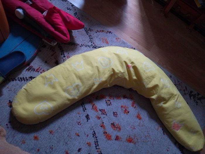 Vends coussin d'allaitement en très bon état , Pratique pour allaiter et poser bébé le temps d'une petite sieste . L'intérieur est en petite bille de polystyrène, agréable. La housse se retire et peut se laver . 100% coton , jaune avec des coeurs blanc et des petites couronnes.