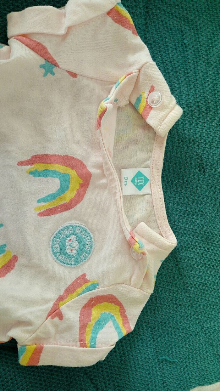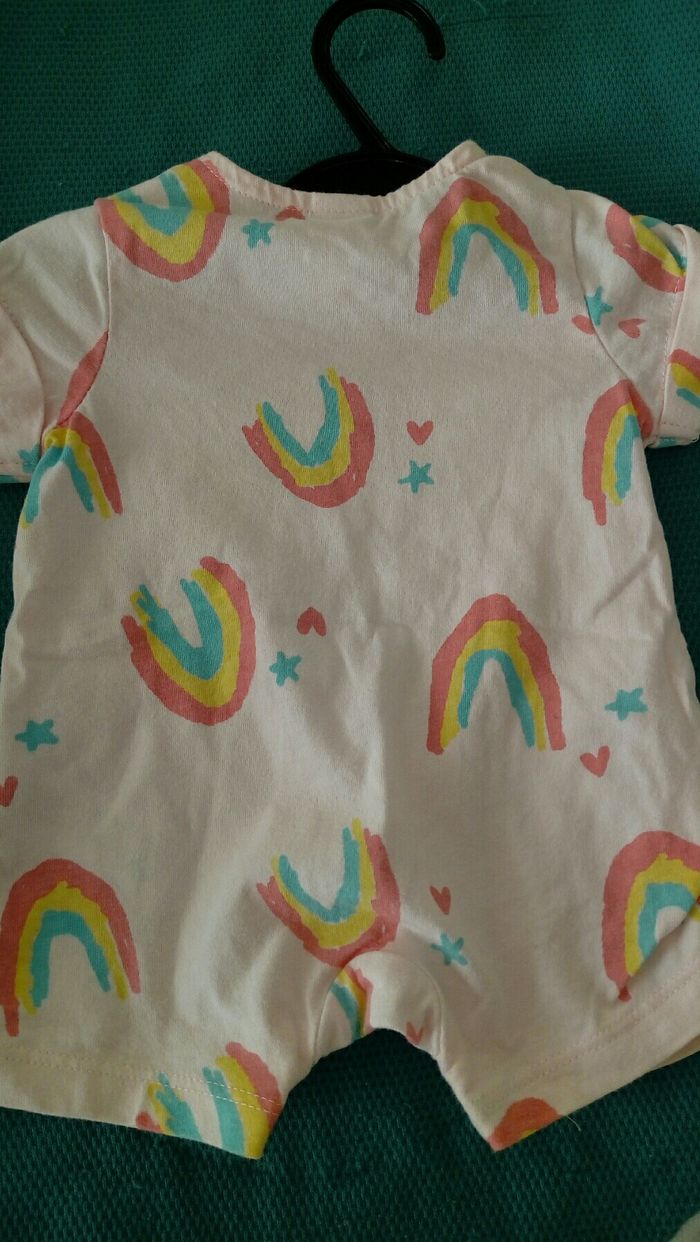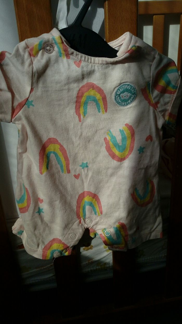 Barboteuse été, couleur rose avec motifs arc en ciel. Boutons à pression entre les jambes et boutons aux épaules. Très bon état.