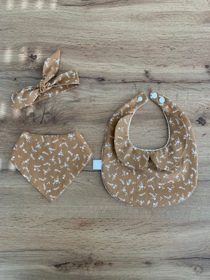 Ensemble bavoir à col Claudine, bandeau à nouer et bavoirs bandana assortis - photo numéro 1