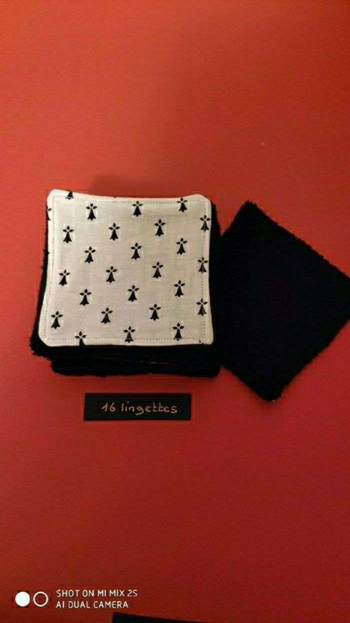 Tissu eko-tex français et éponge bambou noir, 10 X10 cm, pour bébé et démaquillante pour les mamans 😄...