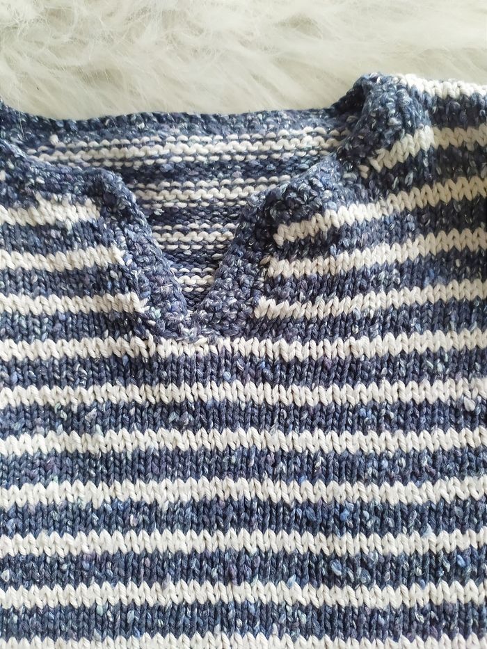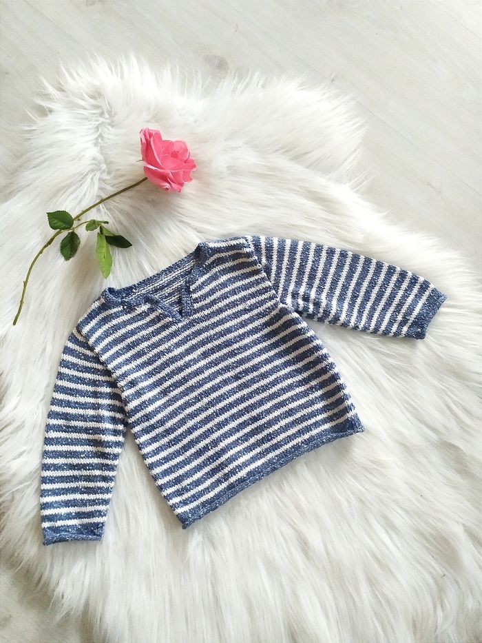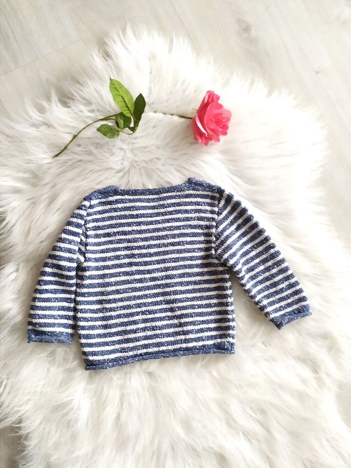 Pull bébé fille tricoté main à rayures 24 mois En coton. Largeur épaules à plat 24,5 cm, aisselles 28 cl. Longueur 30 cm.