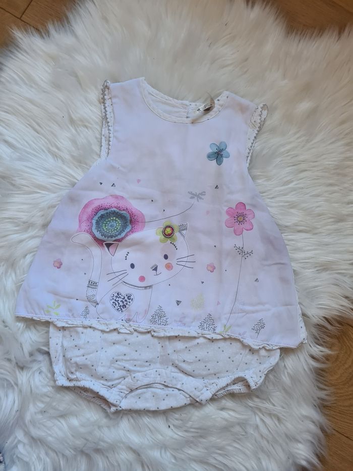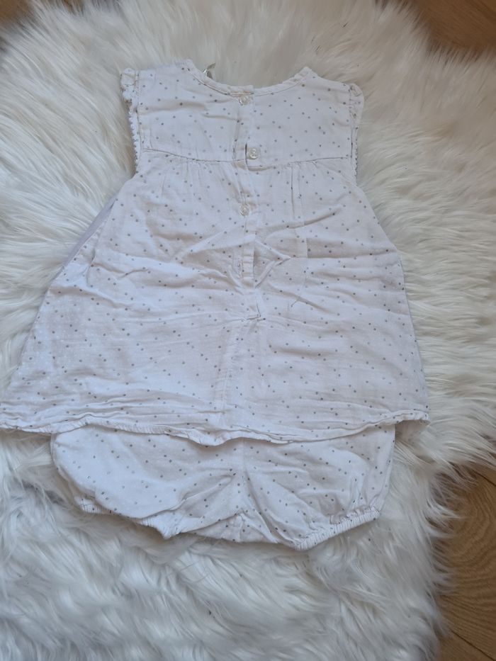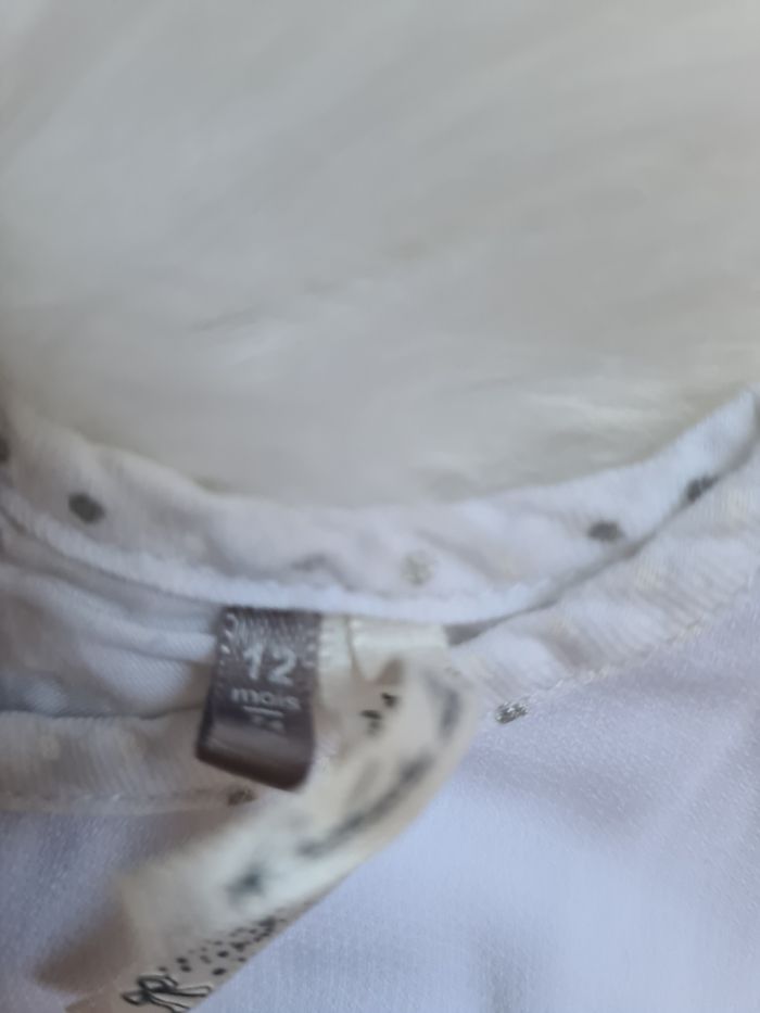 Barboteuse blanc avec petite dessins devant , Derrière blanc à pois gris Orchestra 12mois