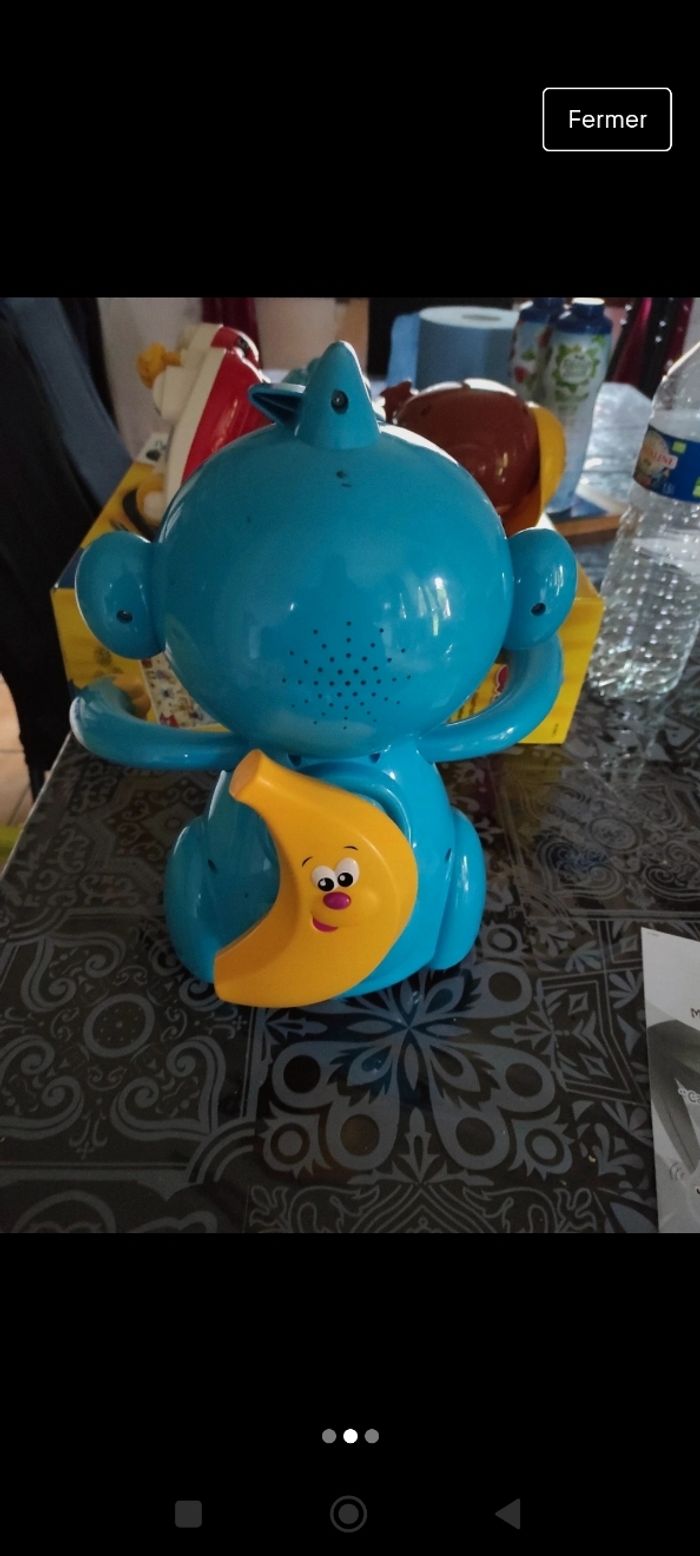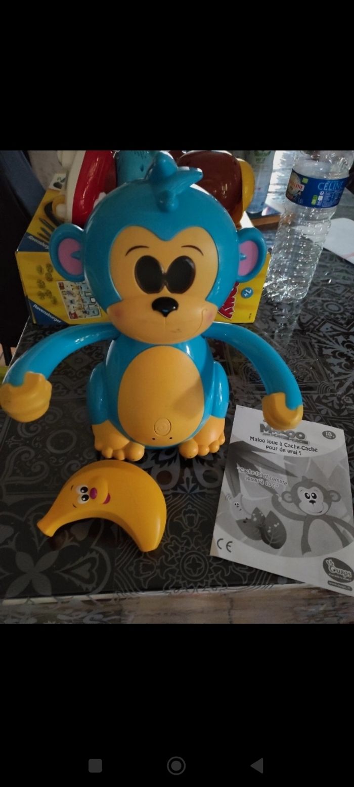 Parle chante et avance tourne et cherche sa banane Très amusant pour les petits de 2 ans et plus Possède la notice mais plus la boîte d'origine