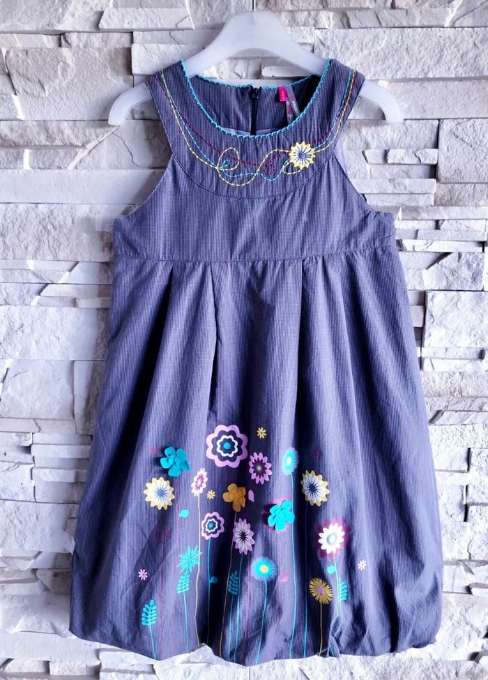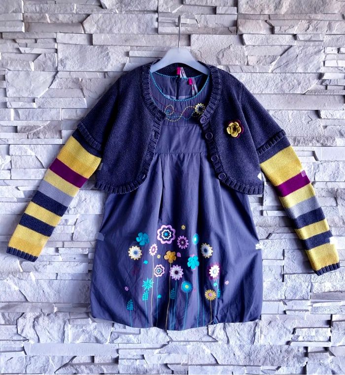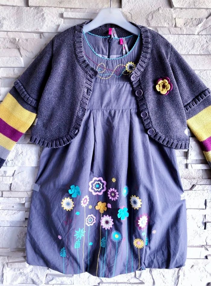 MARQUE : ORCHESTRA... ETAT : TRÈS BON !!! TAILLE : 8 ANS OU STATURE 128 CM COLORIS : GRIS + TAUPE + MOUTARDE... COMPOSITION : COTON + DIVERS MOTIF : FLEURS PARTICULARITÉS : - Gilet 2/1 Style Boléro - Robe Forme Boule - Fleurs Reliefs sur Bas de Robe - Broderies Fantaisies sur Encolure - Contraste de Teintes Lumineuses