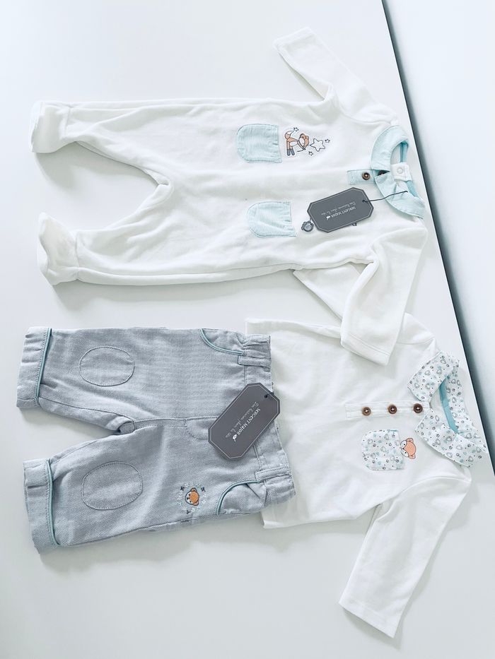Magnifique ensemble complet comprenant un ensemble 2 pièces (Polo et pantalon) + un pyjama, taille 6 mois.