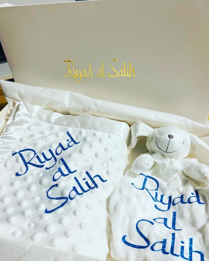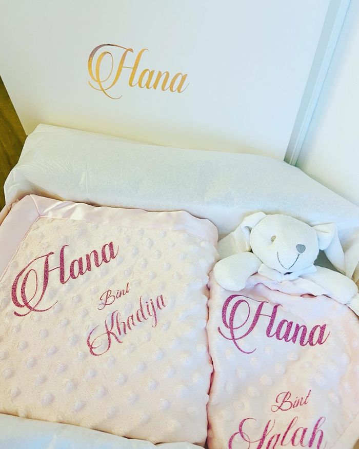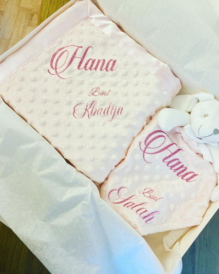 Box naissance comprenant : 1 doudou 1 plaid 75 cm x 75 cm Choix d’écriture et couleurs possible .