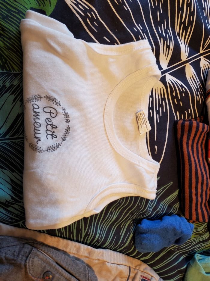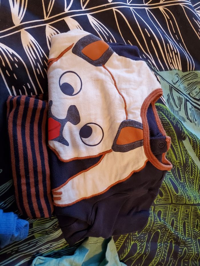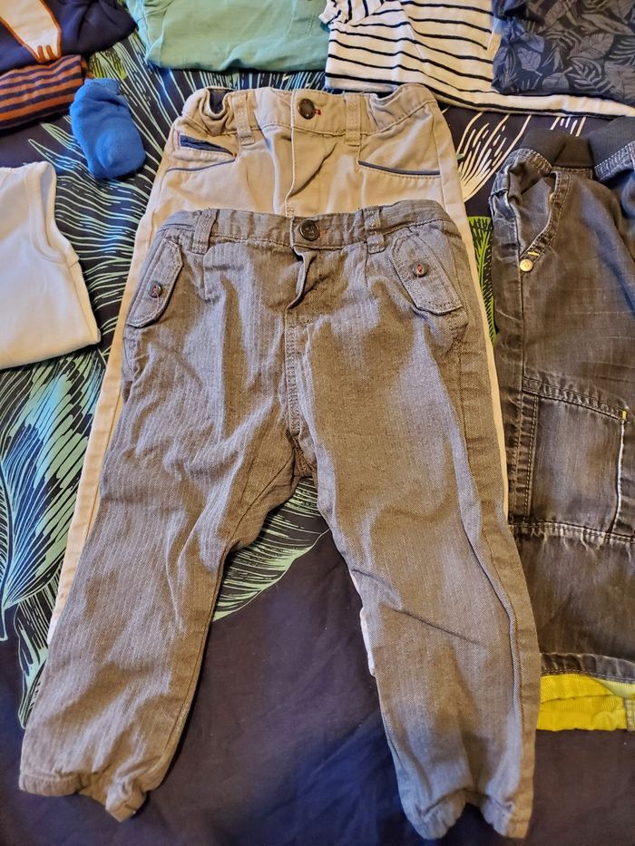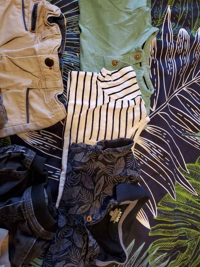 5 pantalons : 2 Obaibi, 1 orchestra (effet "usé"), 1 TeX, 1 inconnu (type jogging) 3 t-shirt manches courtes Kiabi 1 body sans manche 1 pyjama deux pièces Dpam Pyjama un peu délavé et une petite tâche sur le chien