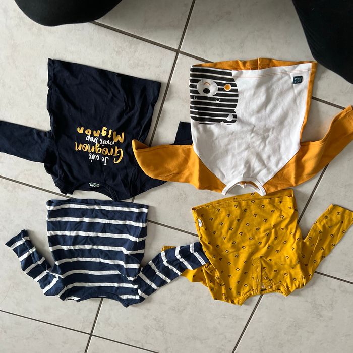 Lot de 4 tee short manche longue Le jaune avec les ancre est de chez kiabi Le marinière est de chez mots d’enfant Le jaune et blanc est de chez sucre d’orge Le bleu avec écriture est de chez kiabi