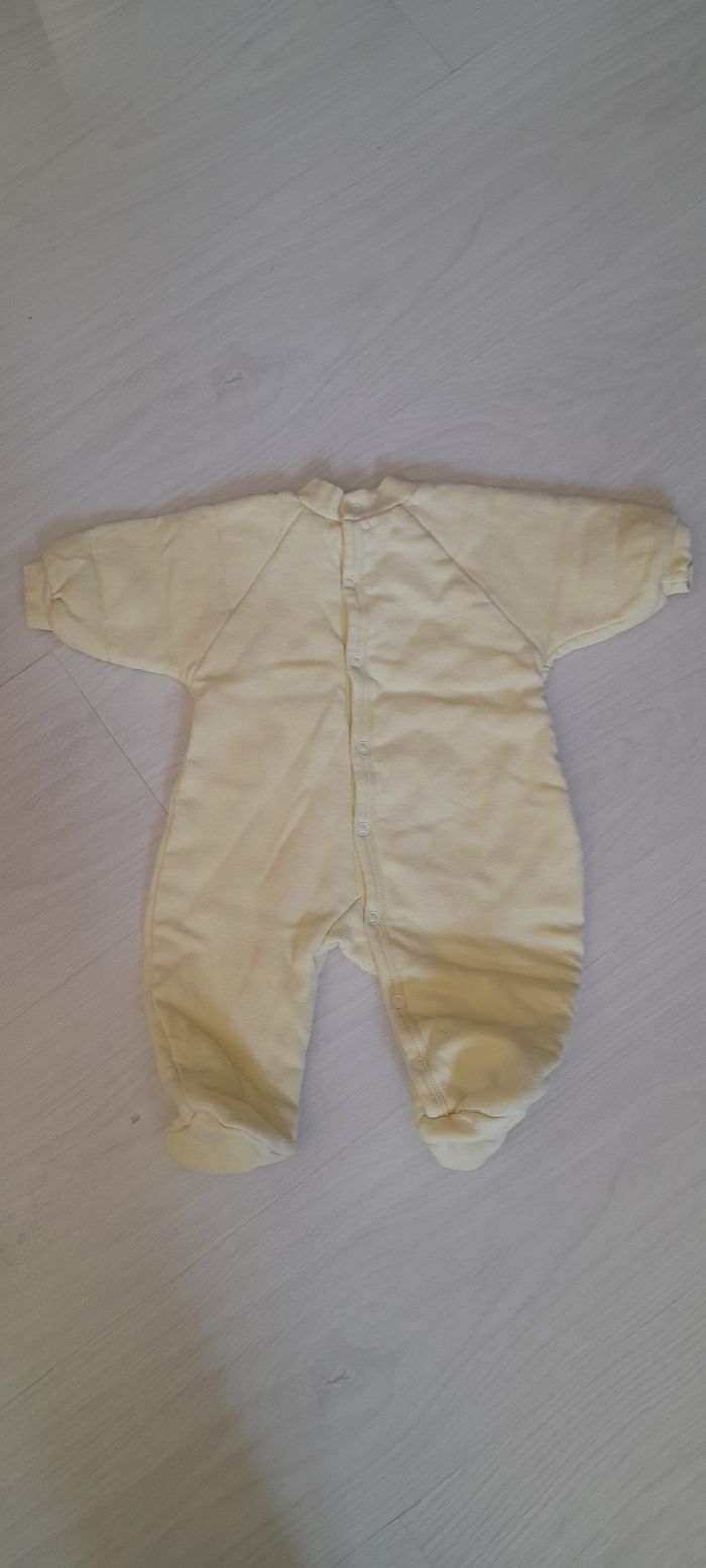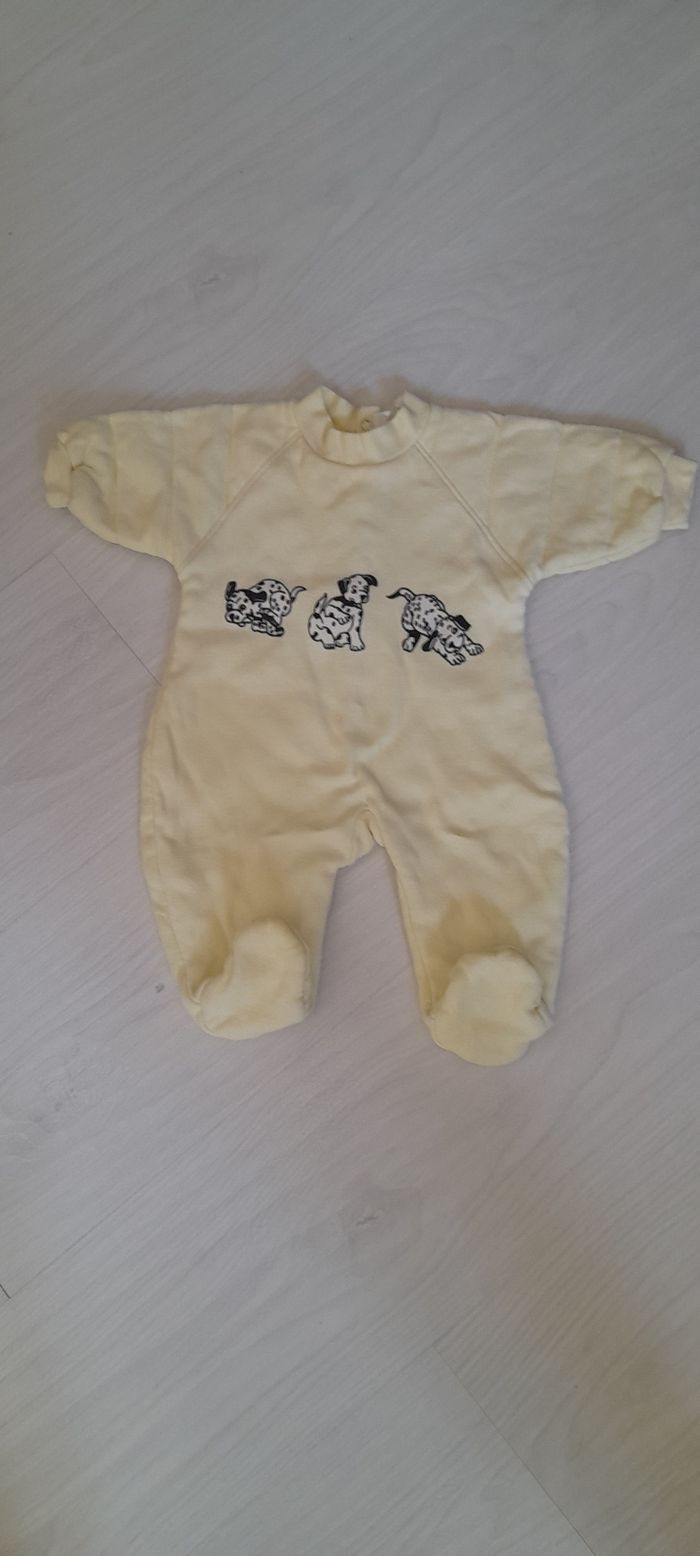 Grenouillère T 3 mois Couleur jaune clair Motif Dalmatien devant Manches longues Avec pieds Attache pressions sur tous le dos et sur entre jambes Très chaud Très très bon état