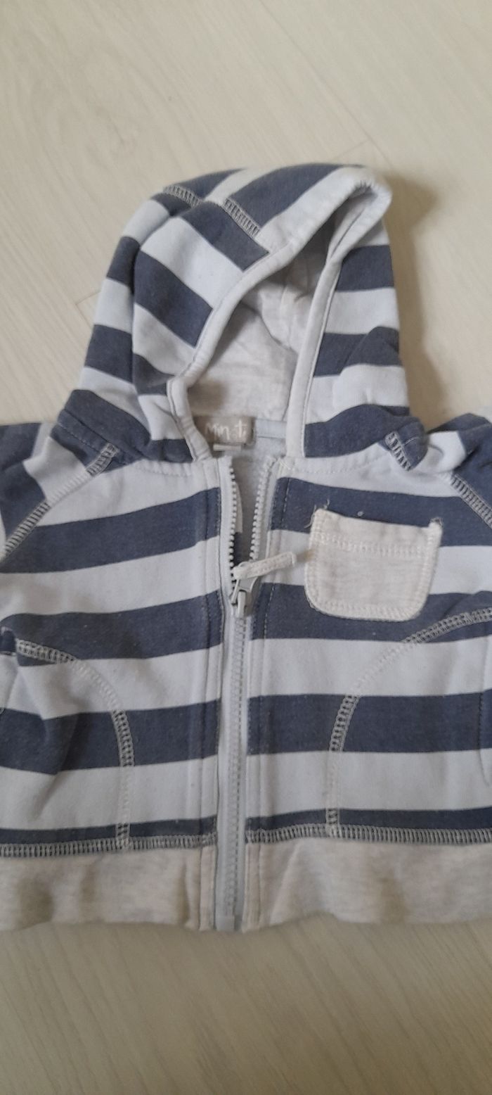Veste T 3 mois Marque MINETI Couleur bleu marine et bleu clair Attache central fermeture éclair Manches longues Capuche 2 poches devant 1 poche poitrine Très très bon état