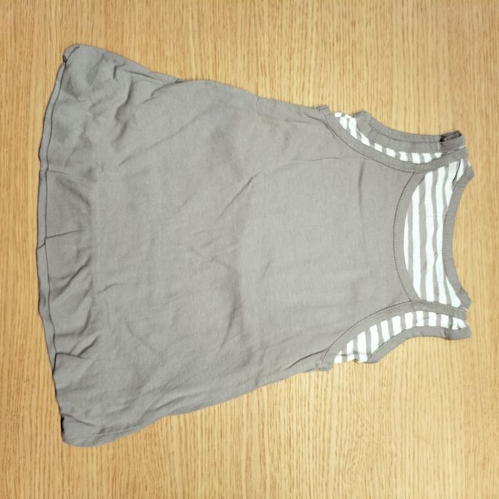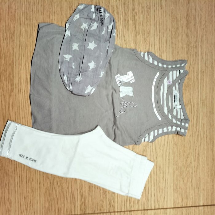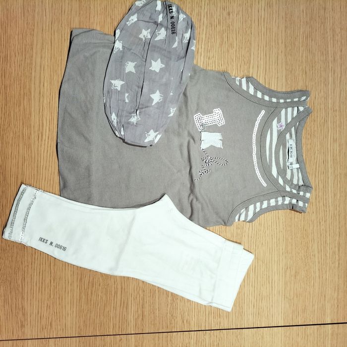 Ensemble composé : d'une tunique sans manche, effet doublée, gris/taupe avec détails blanc et rosé, d'un leggings blanc avec paillettes et d'un bandeau gris/taupe à étoiles blanches pour la tête. De la marque IKKS en 12 mois. Très bon état de la tunique et du bandeau, le legging un petit point à l'entrejambe et quelques traces, cf photos.