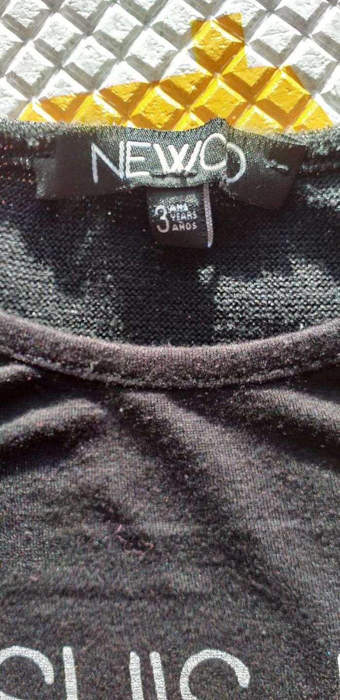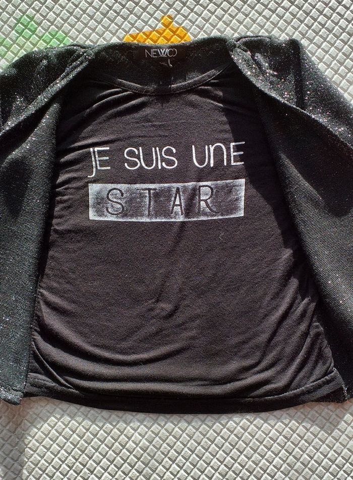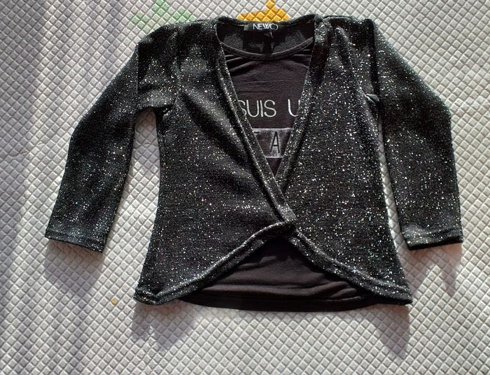 Gilet intégré au tee-shirt. Noir avec des paillettes. Ecriture sur le devant. Porté peu de fois.