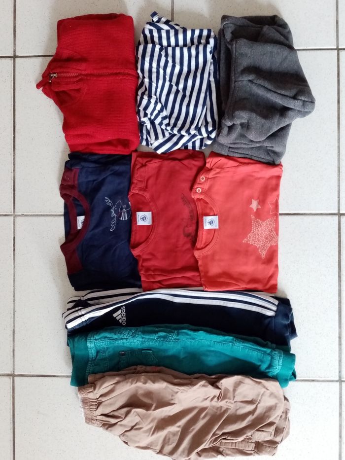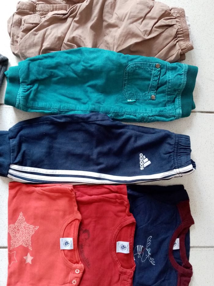 Lot automne/ hiver 12 mois garçon Composé de 3 pantalons dont 1 Adidas, 3 tee-shirts petit bateau, gilet rouge chaud et sweat à capuche gris petit bateau Les autres vêtements sont de la marque obaibi TBE
