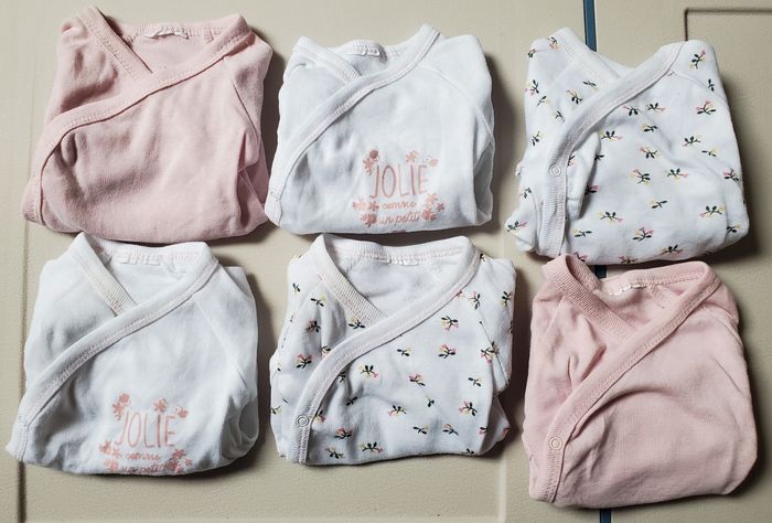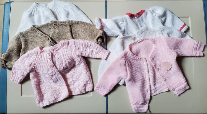 Lot de naissance pour fille en très bon état. Porté seulement 2 semaines. Plusieurs marques, bout'chou, mon premier major...layettes tricotée à la main. L'ensemble du lot est Idéal pour les premières semaines de bébé !