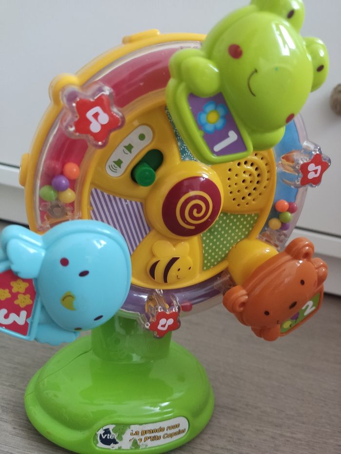 Avec la Grande Roue des P'tits Copains, votre enfant va s'amuser pendant des heures de jeu et faire le plein de découvertes dès son premier â ge. Ce jeu d'éveil permet à votre enfant de tourner la roue et de déclencher des son rigolos et mélodies. Le jouet musical dispose d'un total de 10 mélodies et 5 chansons. Le jouet éducatif électronique possède 3 boutons Animaux (ours, grenouille, oiseau) qui permettent à votre enfant de découvrir noms, couleurs, objets et les premiers chiffres. Les 3 étoiles lumineuses attirent son attention. La lumière clignote en rythme avec les sons. Avec ventouse de fixation.