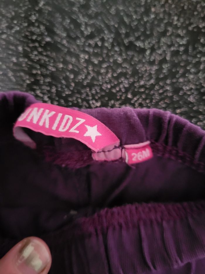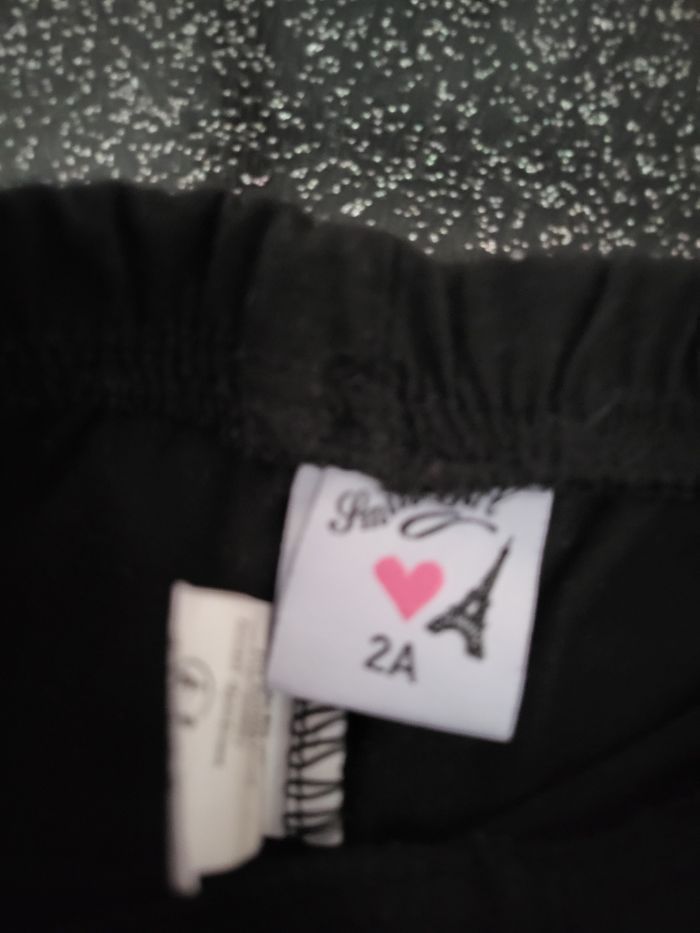 1 legging noir avec bande sur les côtés " urban style teens", smile girl. 2 ans légère bouloche. 1 legging violet avec frou frou au cheville punkidz taille 26 mois. Beaucoup mis.