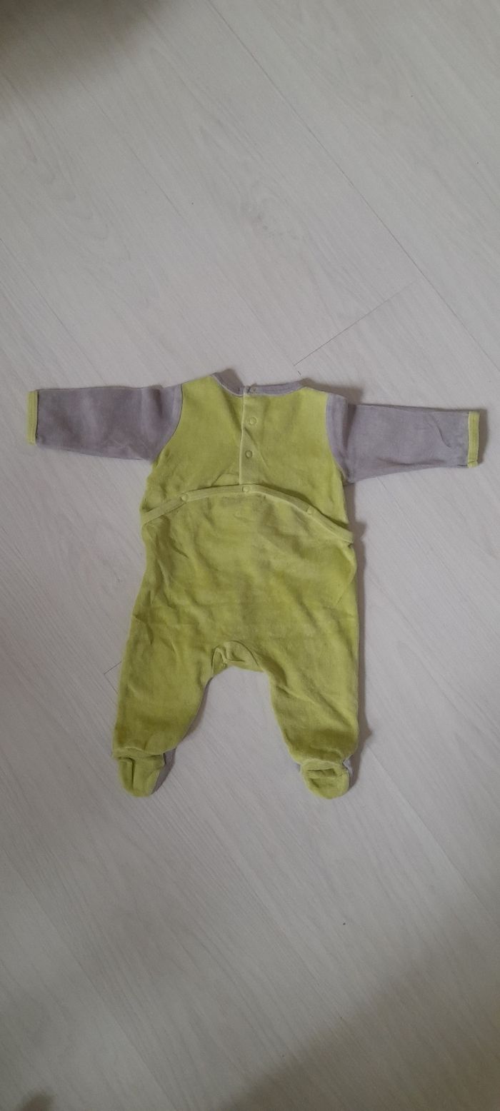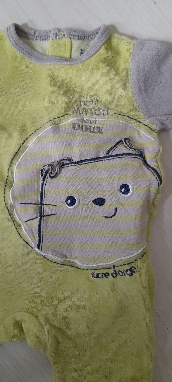Grenouillère T 3 mois Marque SUCRE D'ORGE Couleur vert pomme et gris Motif broder devant Avec pieds Attache pressions à l'arrière Très très bon état