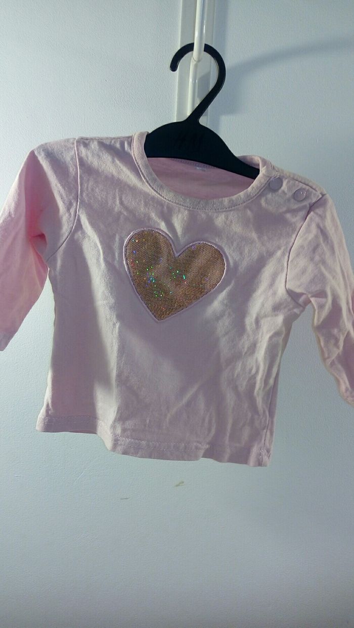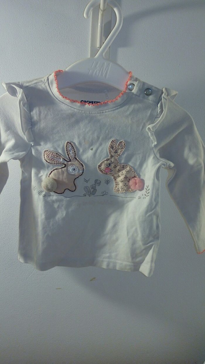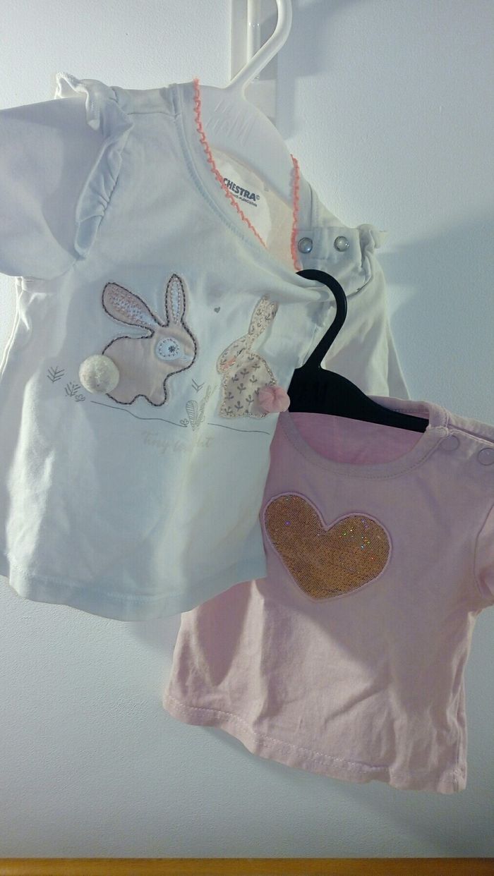 Lot 2 t shirts manches longues, taille 6 mois. Un t shirt blanc motifs lapins, marque Orchestra, boutons à pression à l'épaule et l'autre: couleur rose, motif coeur à paillettes, sans marque, boutons à pression à l'épaule. Très bon état.