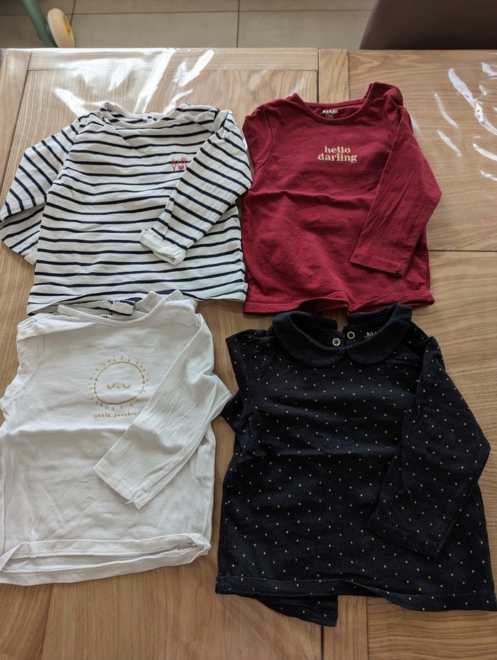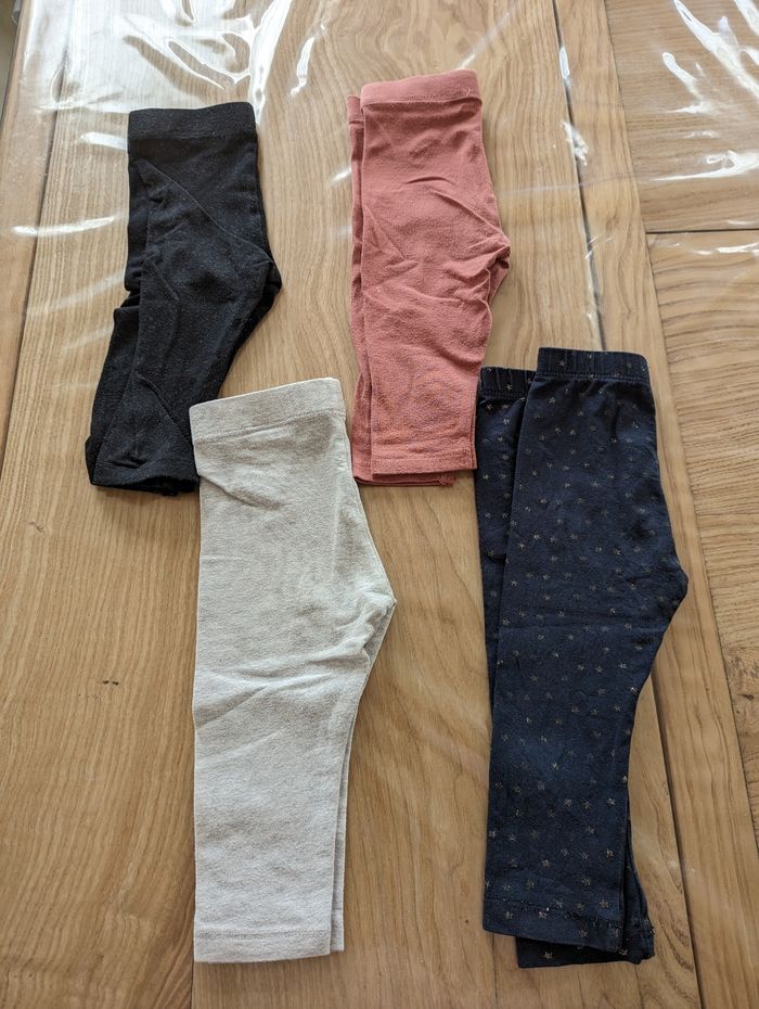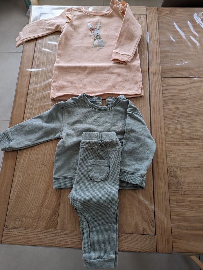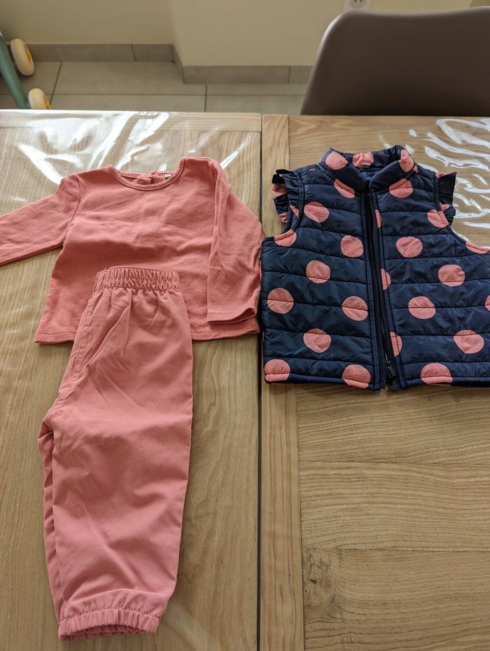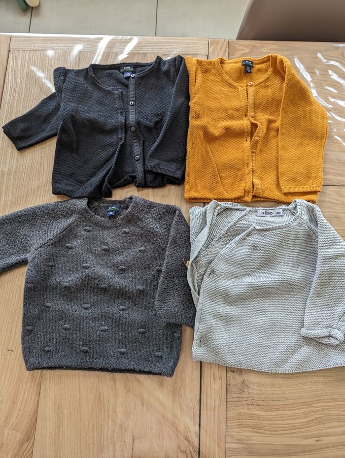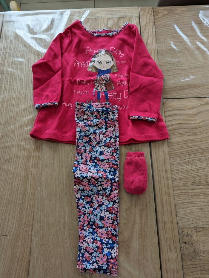 3 pyjamas 1 robe rose lapin 1 jogging Kiabi 1 ensemble avec chaussette 4 leggings 4 pulls/gilets 4 hauts manches longues Kiabi 1 ensemble avec doudoune Certains vêtements jamais porté. Plusieurs marques Kiabi, Gémo et autres.