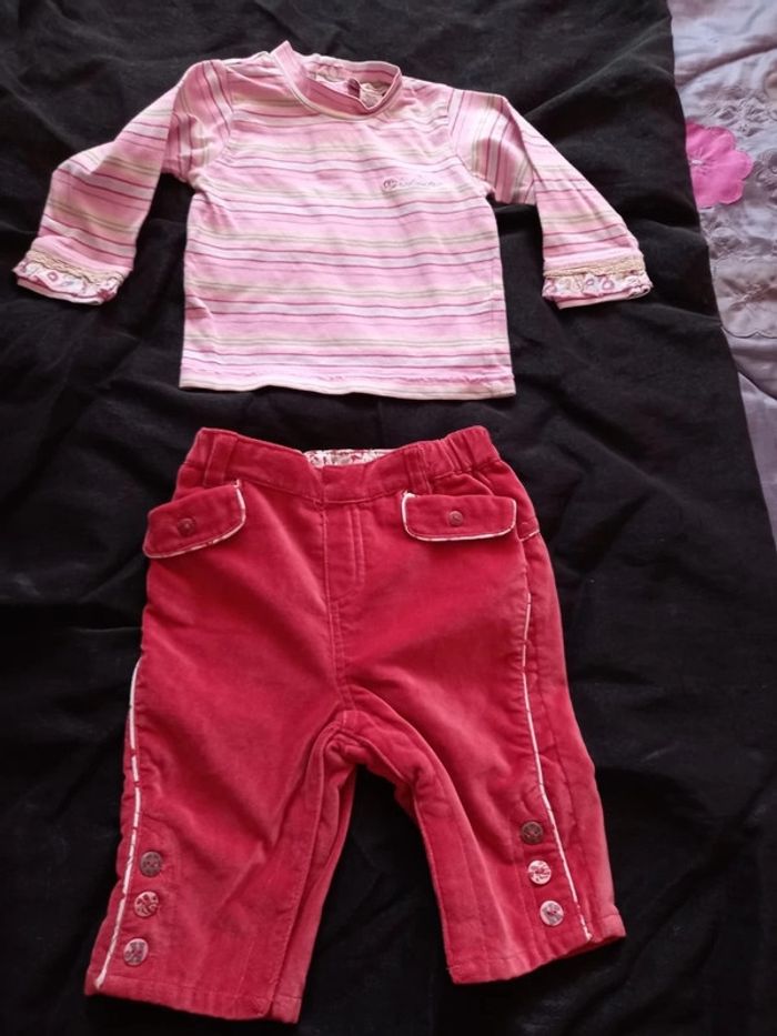 ENSEMBLE 6 MOIS composé d'un tee shirt ORCHESTRA, pressions dans le dos + pantalon velours KITCHOUN, pressions devant, taille élastiquée derrière, boutons en bas des jambes