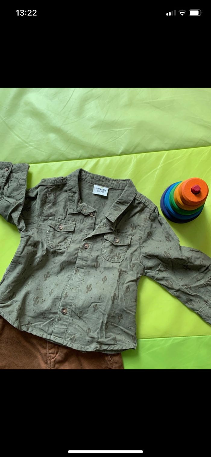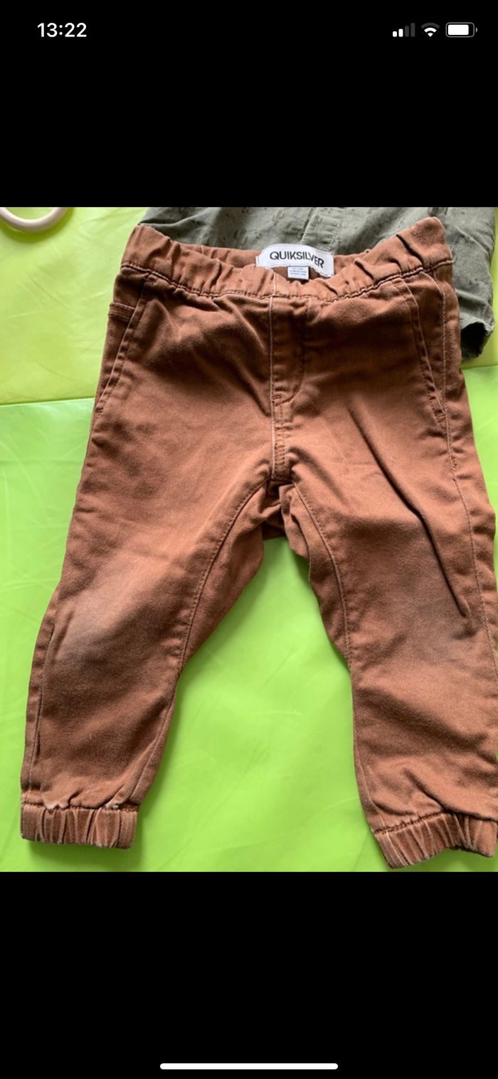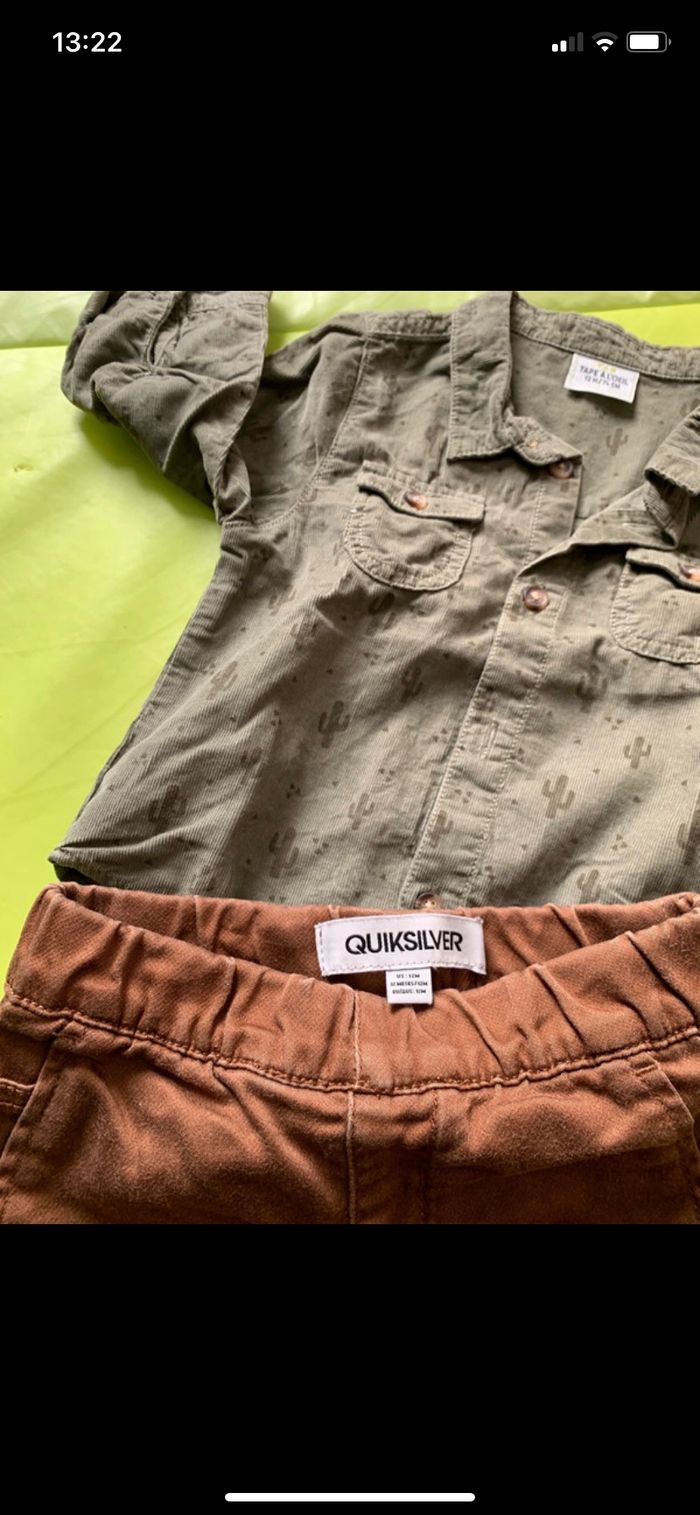Chemise tape à l’œil verte kaki avec motif cactus en très bon état. Pantalon QuickSilver avec quelques signes d’usure sur les genoux mais peut encore bien servir. Couleur marron clair, très confortable. Taille 12 mois